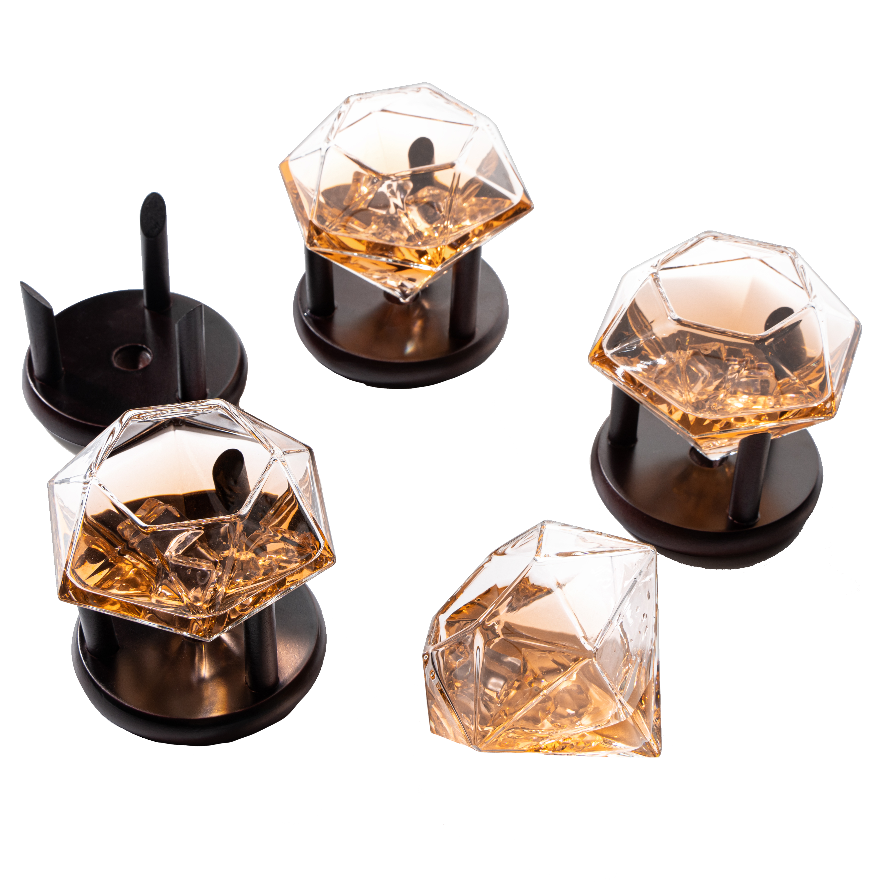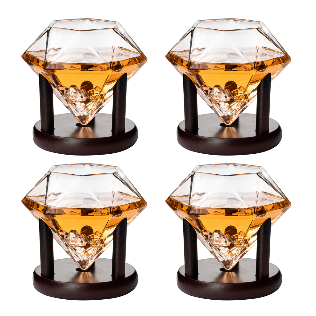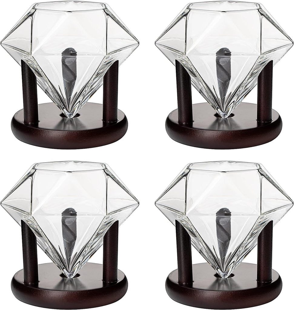 Set of 4 Diamond Whiskey & Wine Glasses With Wood Stands 10oz - Wine, Whiskey, Water, Diamond Shaped, Diamonds Collection Sparkle Patented Wine Savant - Stands Alone, Or on Stand