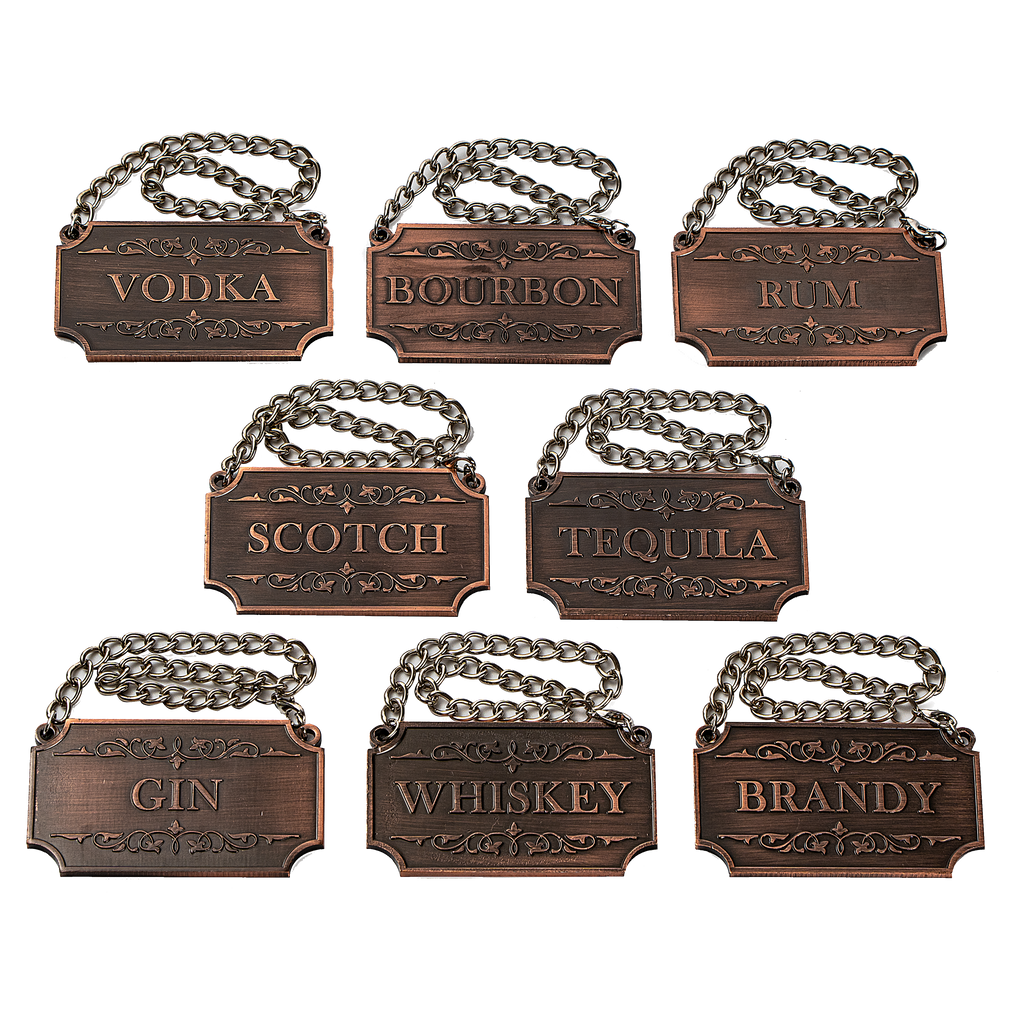 Decanter Tags Copper Set of 8 for Alcohol - The Wine Savant - Bottle - Whiskey, Scotch, Bourbon, Gin, Rum, Vodka, Tequila and Brandy, Fits All Bottles, Great Home Gift, Gifts for Men & Women 3" L 2"H