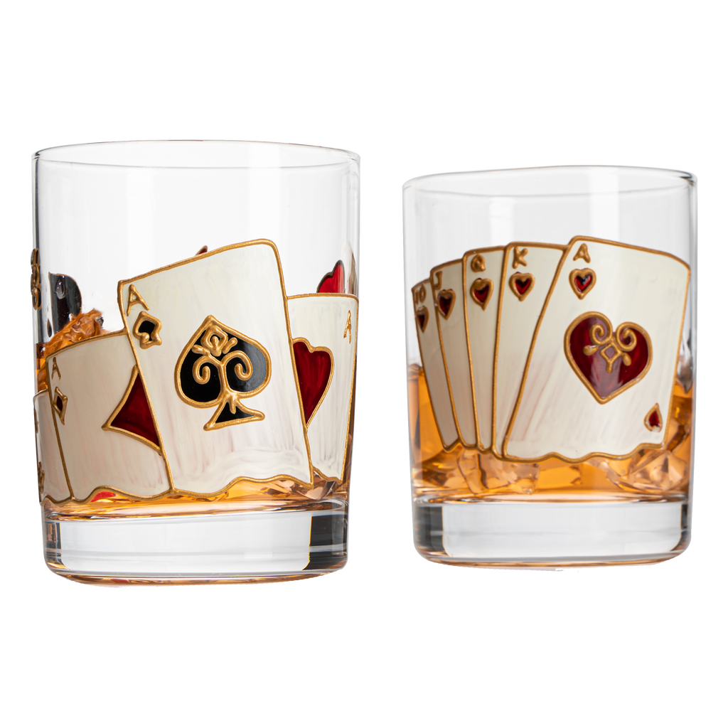 Playing Cards Drinking Glasses - Artisanal Hand Painted Players Casino Set of 2 Water, Wine & Whiskey Glasses - The Wine Savant - Crystal Glassware - Gift Idea for Him, Birthday, Housewarming - 12oz