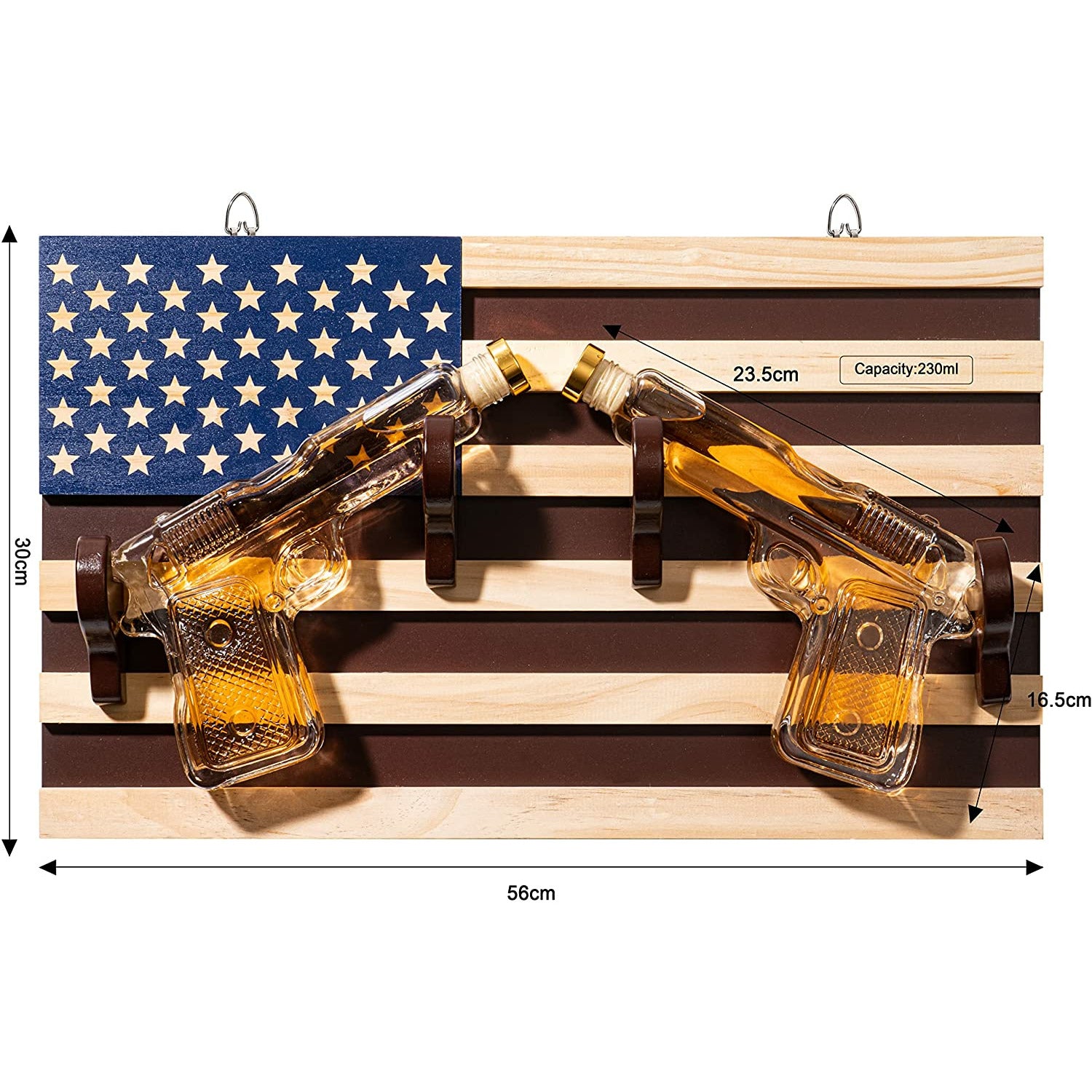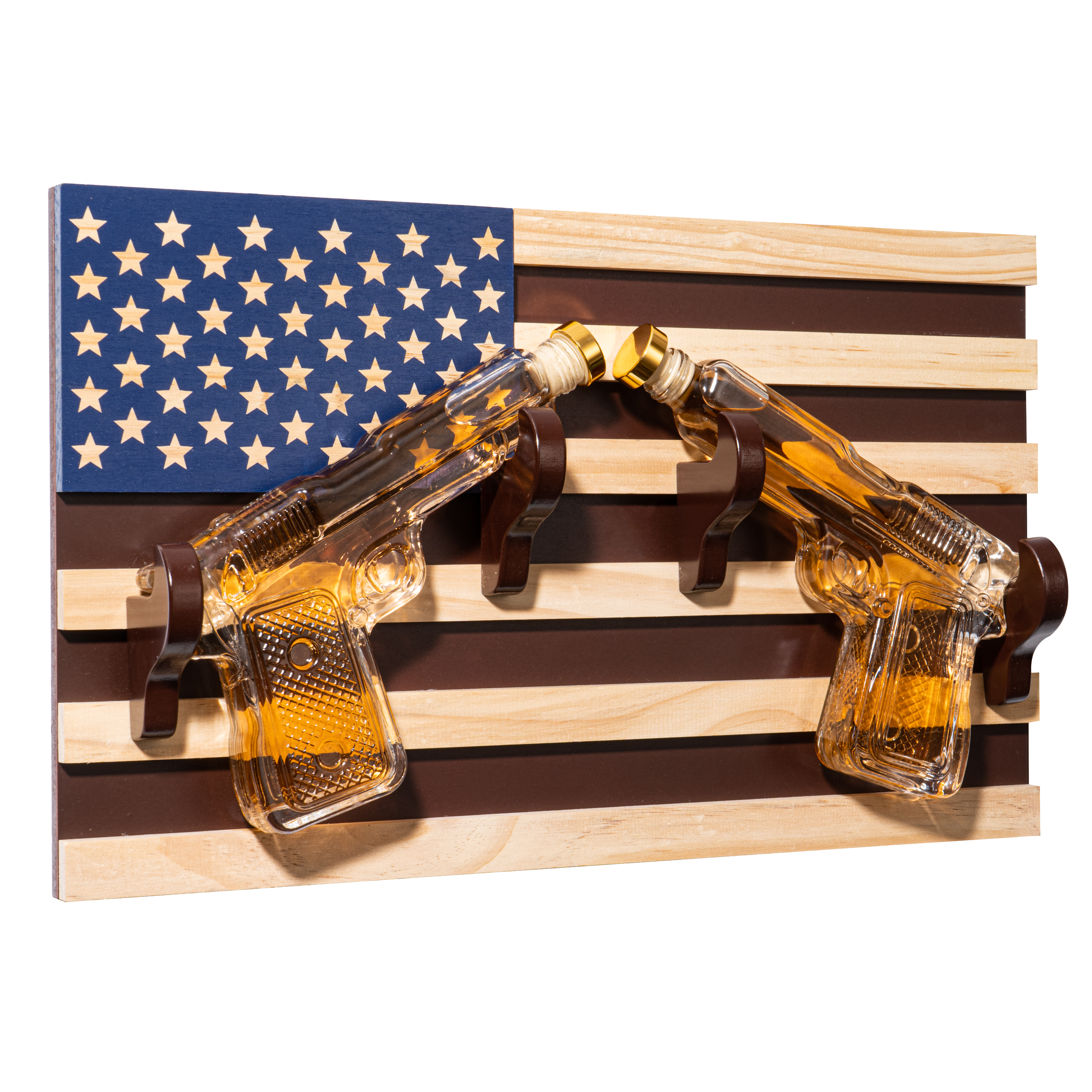 - Shock your guests with this double Pistol Gun Decanter Set paired with an elegant American Flag wooden display stand. Can you imagine how classy this will look in your bar? This elegant gun shaped wine, whiskey or spirits decanter pistols are paired with a wooden display stand that makes it a classic piece in any home bar. Perfect gifts for men and women members of law enforcement, military, police officers!