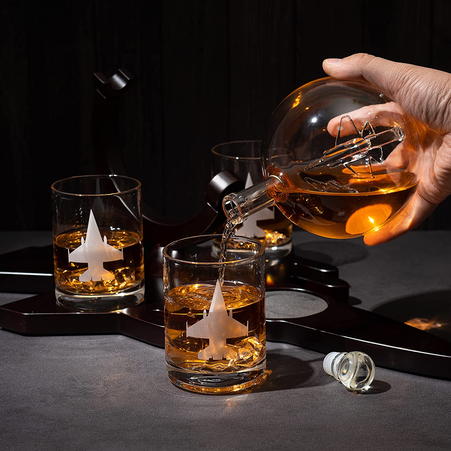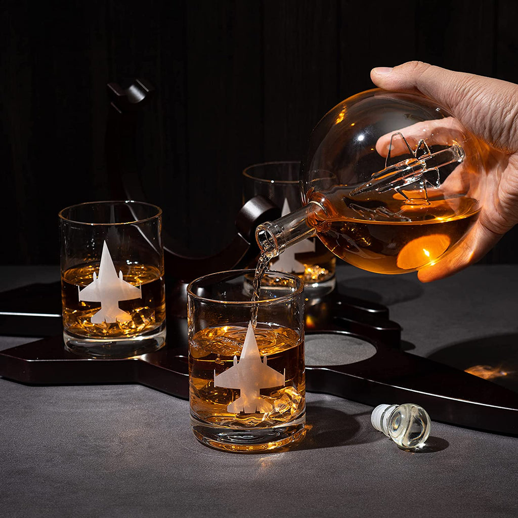 - Experience a flight of decanters with this superb set! This set is crafted from the highest quality glass, comes in an elegant gift box, includes four unique Fighter-Jet Whiskey Glasses so you can enjoy each serving in style Whether you are a veteran or new to the fine art of enjoying whiskey, this hand crafted decanter set is made for you! This F16 Whiskey Decanter Set by The Wine Savant is perfect for the mancave, or for a father or husband that is a combat aviation fan.
