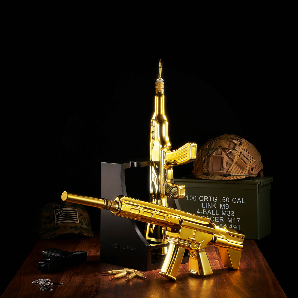 - UNIQUE AND STRIKING DESIGN: The 2 Gun Gold Whiskey Decanters Set & Rifle Gun Decanter is a bold addition to any home bar. Featuring two beautifully crafted decanters in the shape of an AK and an AR15 rifle, this set brings an impressive and unique aesthetic to your drinkware collection. Each piece has a gold finish, giving it a refined yet edgy look that stands out, perfect for gun enthusiasts and those who appreciate distinctive bar accessories.