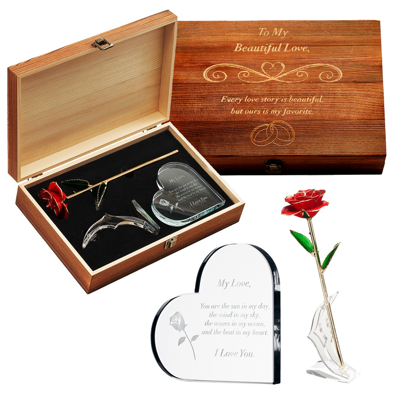 - PROFOUNDLY SIGNIFICANT - This gift is laden with deep sentiments, and any dear one would be ecstatic to receive it. From the meticulously crafted wooden box, to the captivating crystal heart, and the gold-plated red rose, it's a splendid way to enhance your memorable day. The Wooden Gift Box alone is a showstopper, likely to be the talk among attendees. Your wife will undoubtedly be thrilled.