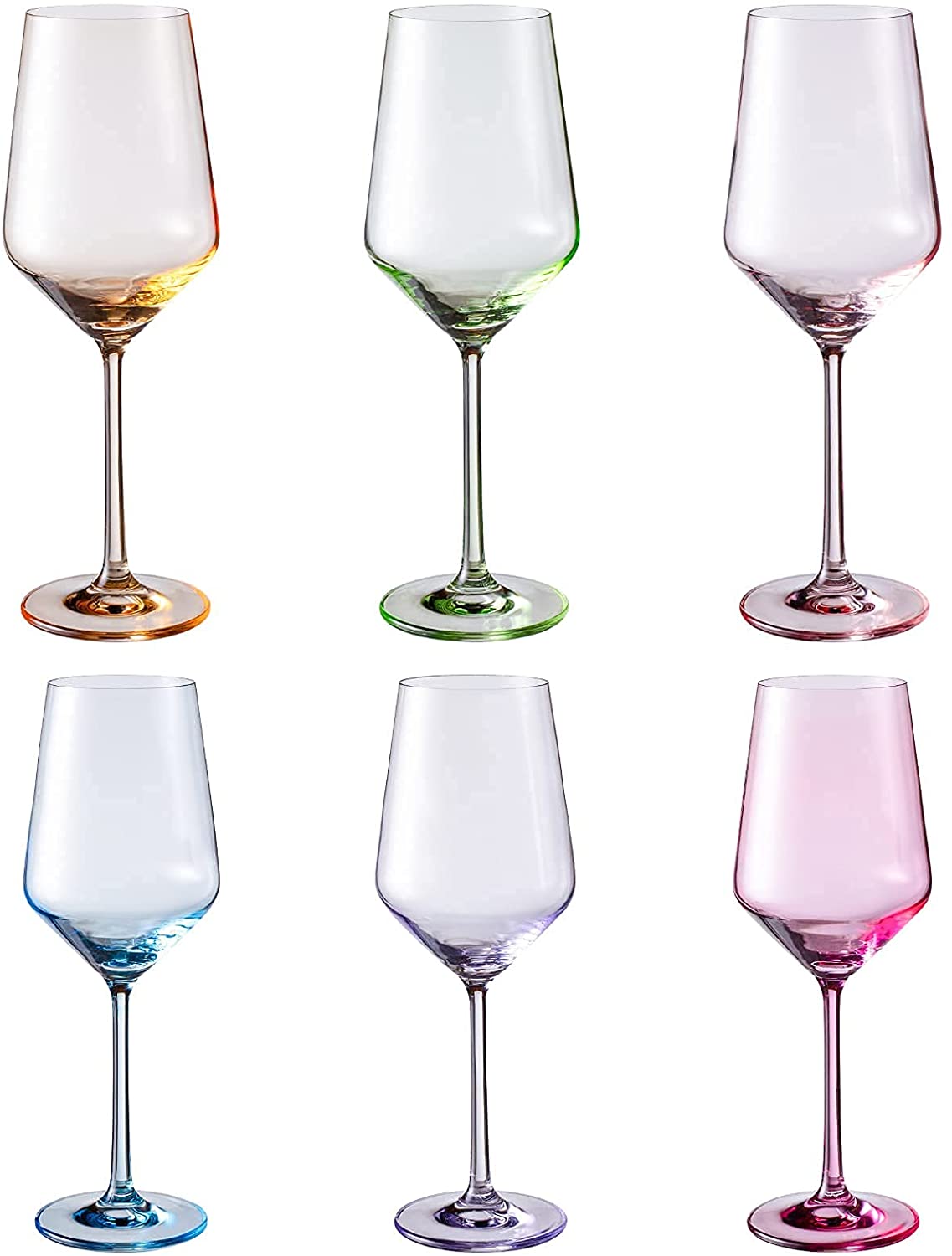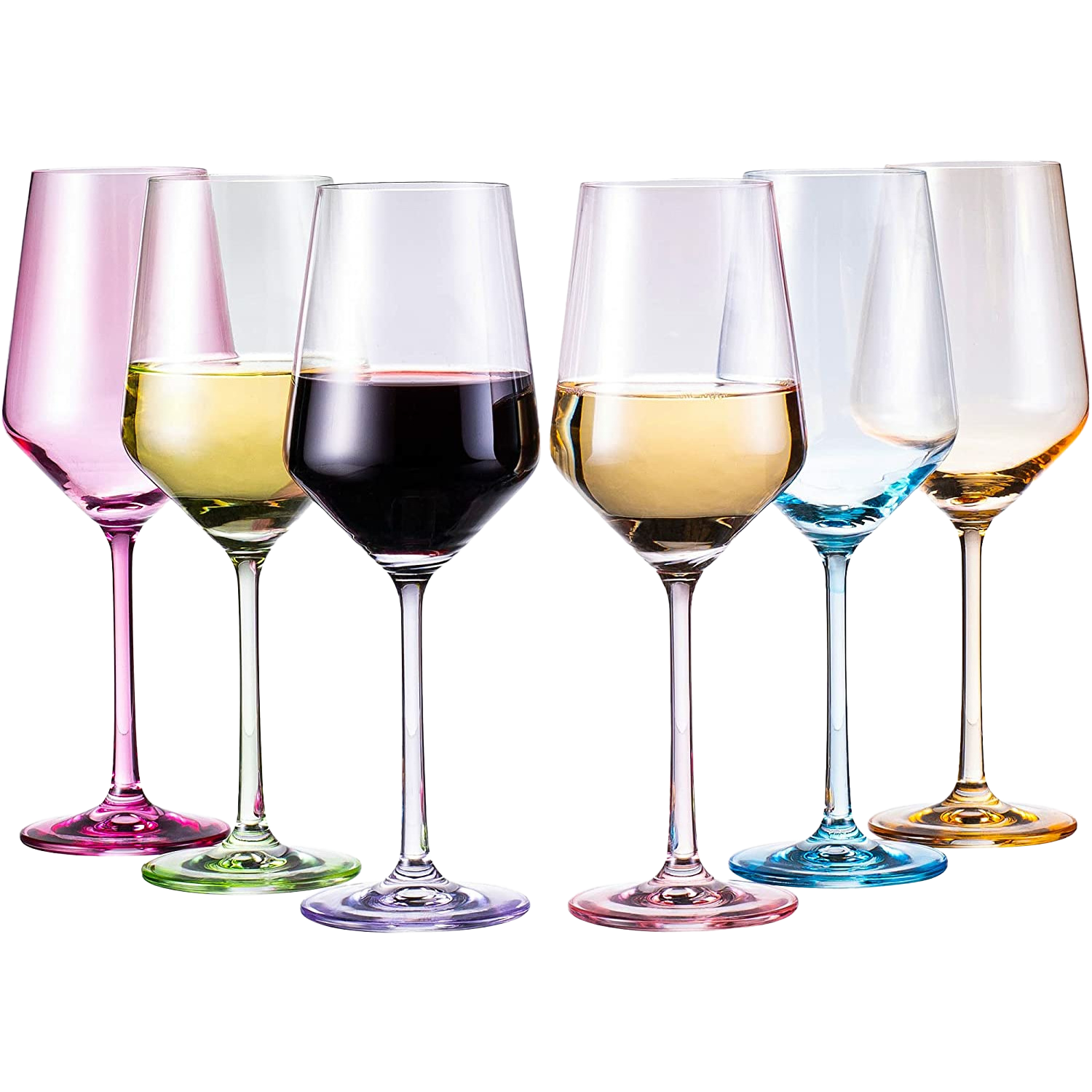 - 6 COLORED WINE GLASSES - Our colorful wine glasses are an instant way to add fun and festiveness to any social event. A beautiful splash of color to accompany a splash of your favorite red or white wine. Featuring six rich, vibrant tinted glass colors.