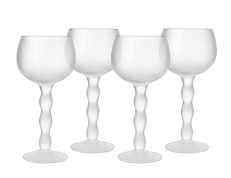 - Elegant and sophisticated, this sandblasted squiggle stemmed wine glass set is a truly unique and gorgeous addition to your barware collection. Featuring a squiggly line down each stem, these are the perfect way to serve up that afternoon glass of wine or cocktail at happy hour. The modern design makes them equally at home on display during parties as they do in everyday use. Each glass measures 6" in height, 3" in diameter, and has a 6.5 ounce capacity.