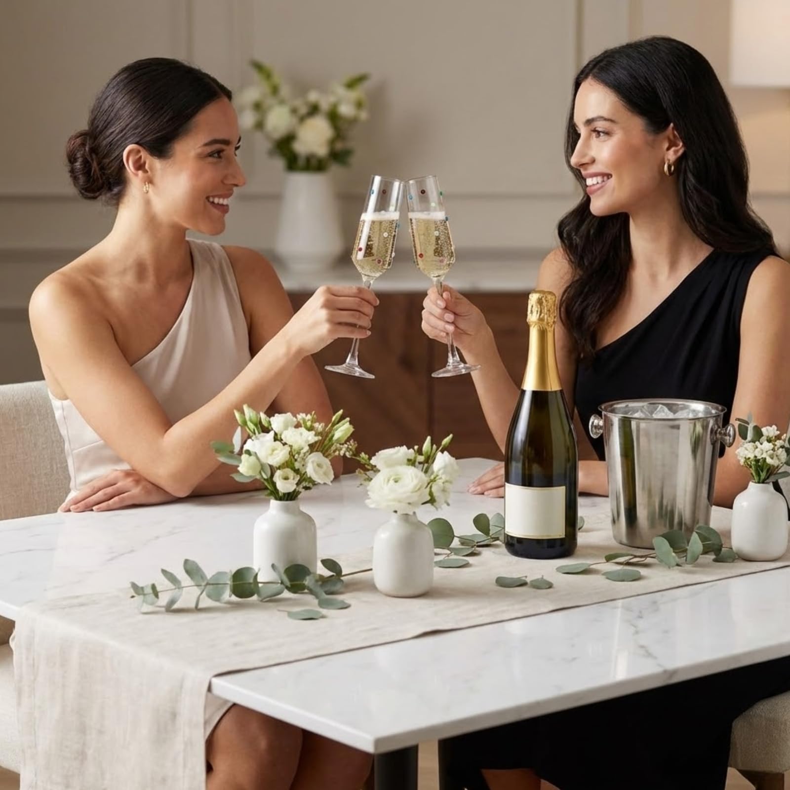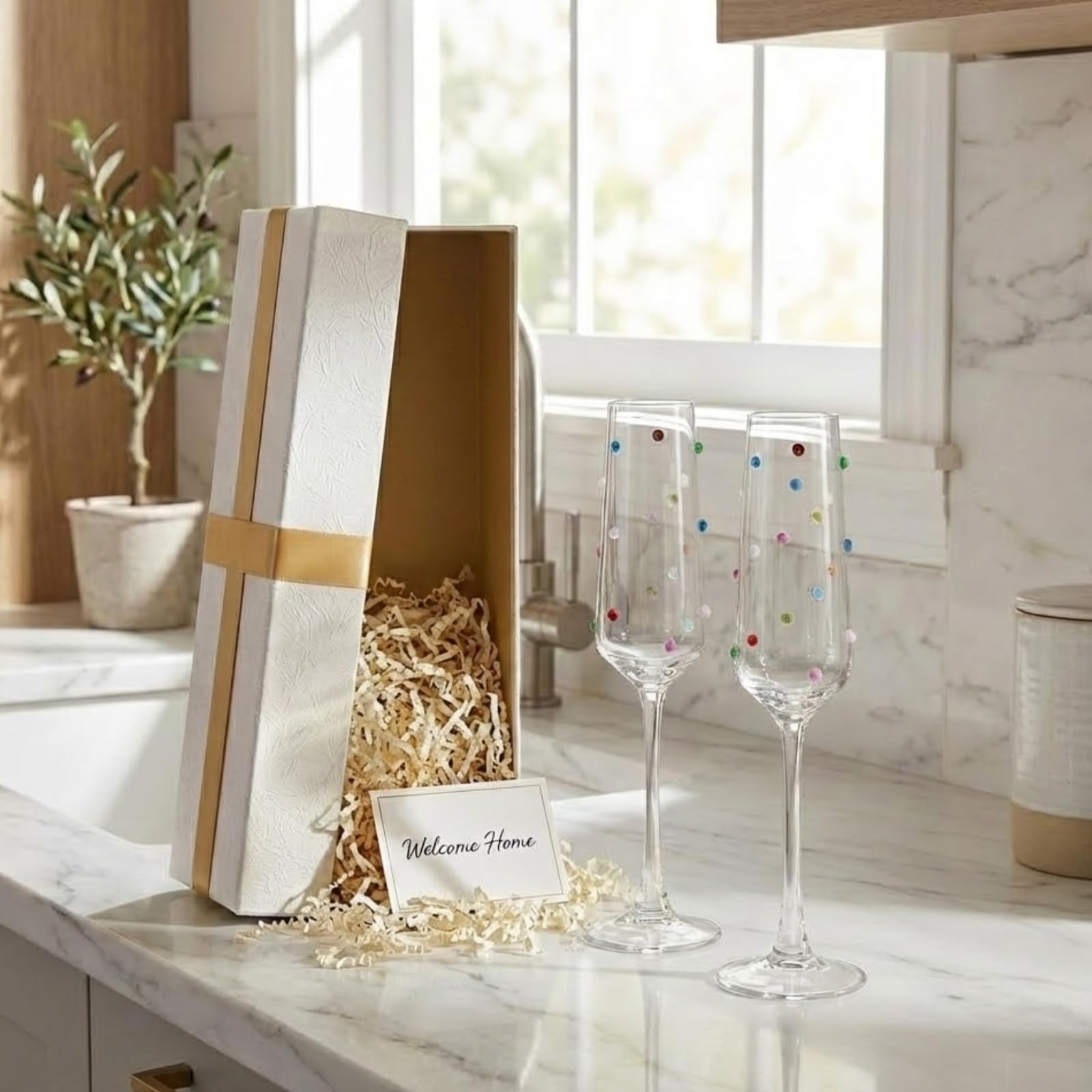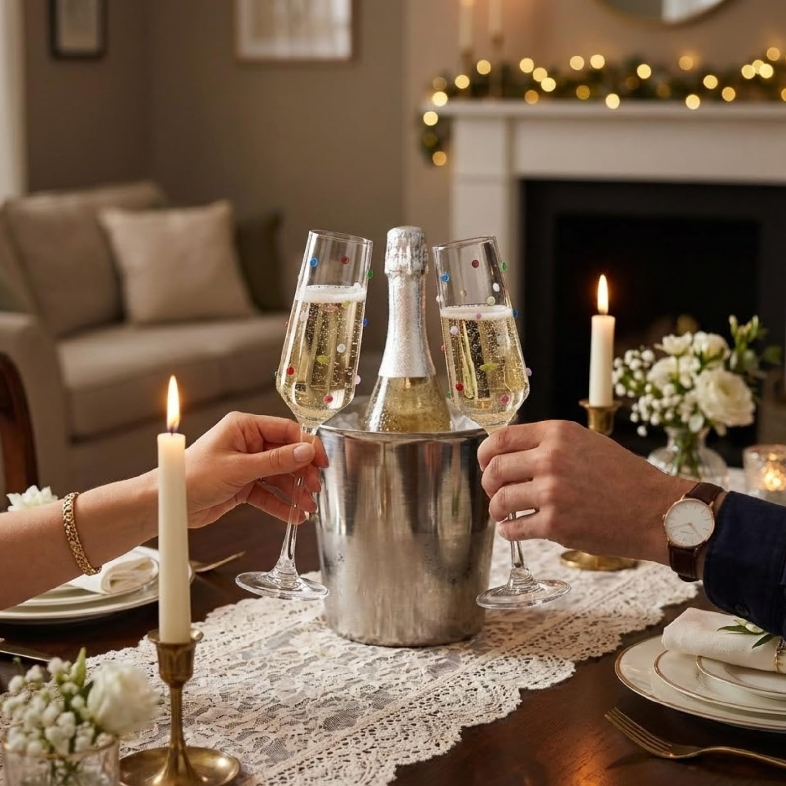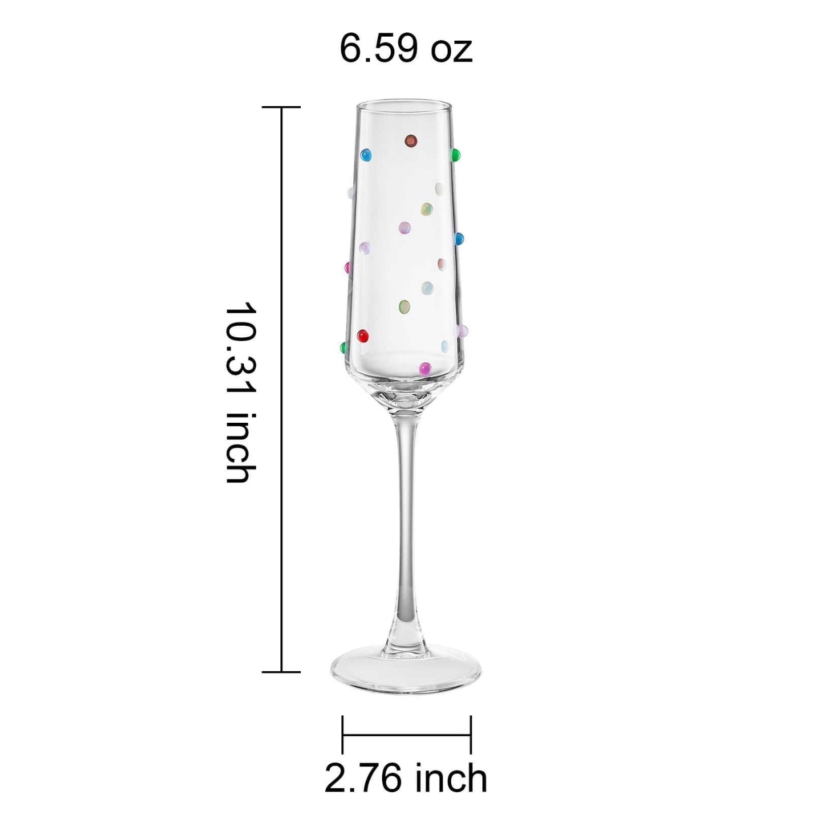 The Confetti Champagne Flutes Set of 2 features a colorful confetti pattern made with bright raised dots that stand out beautifully on tall clear drinkware. Each glass has a long narrow silhouette that enhances bubbles and elevates champagne or wine during any celebration. Every flute shows artisanal details that add charm to your stemmed glassware display. Each glass holds 6.59 oz and measures 10.31 inches tall with a 2.76-inch diameter, offering a classic size for toasts at weddings, anniversaries, parties and special moments. Packaged for effortless gifting, this elegant beverage set is perfect for housewarming events hostess presents or anyone who loves stylish celebration drinkware.