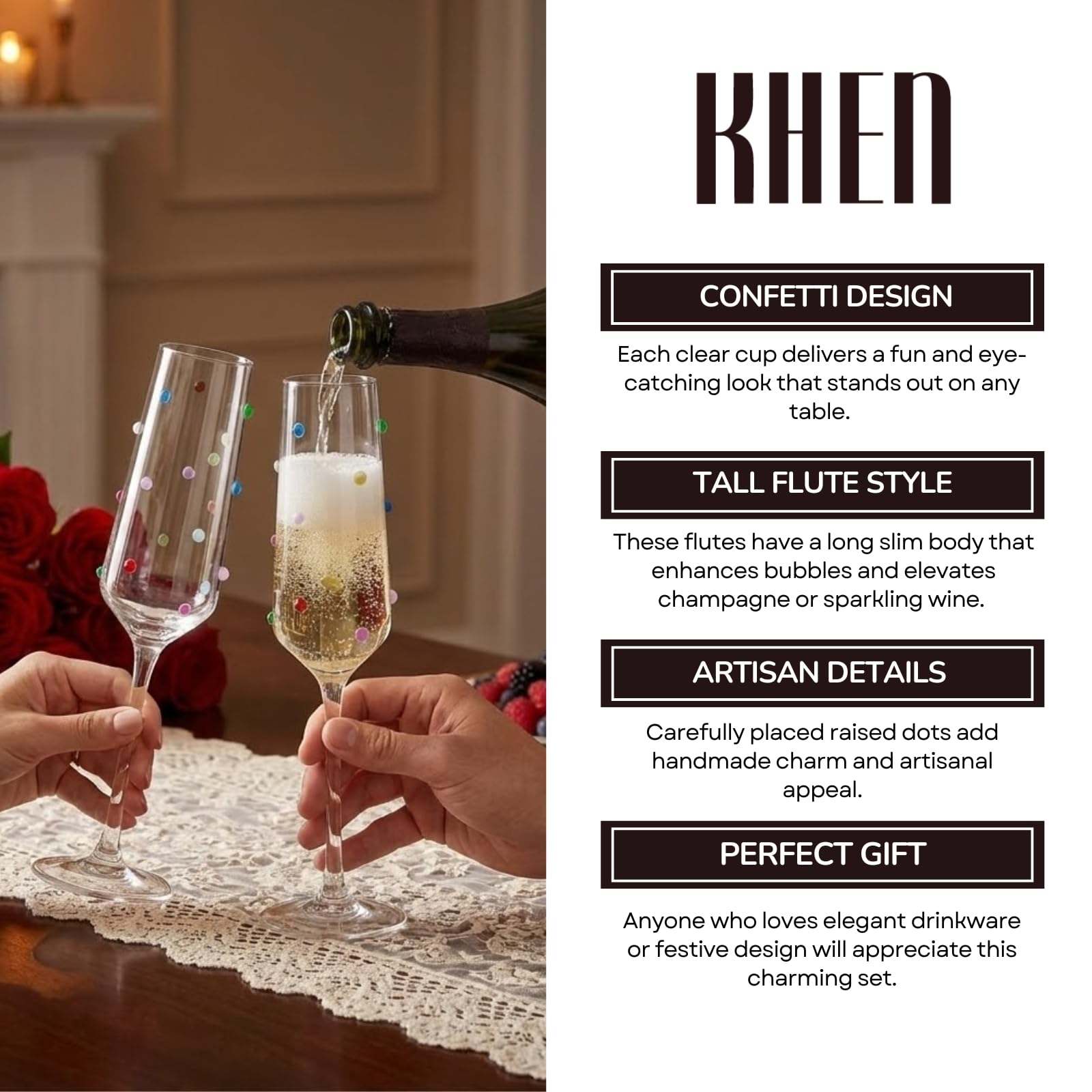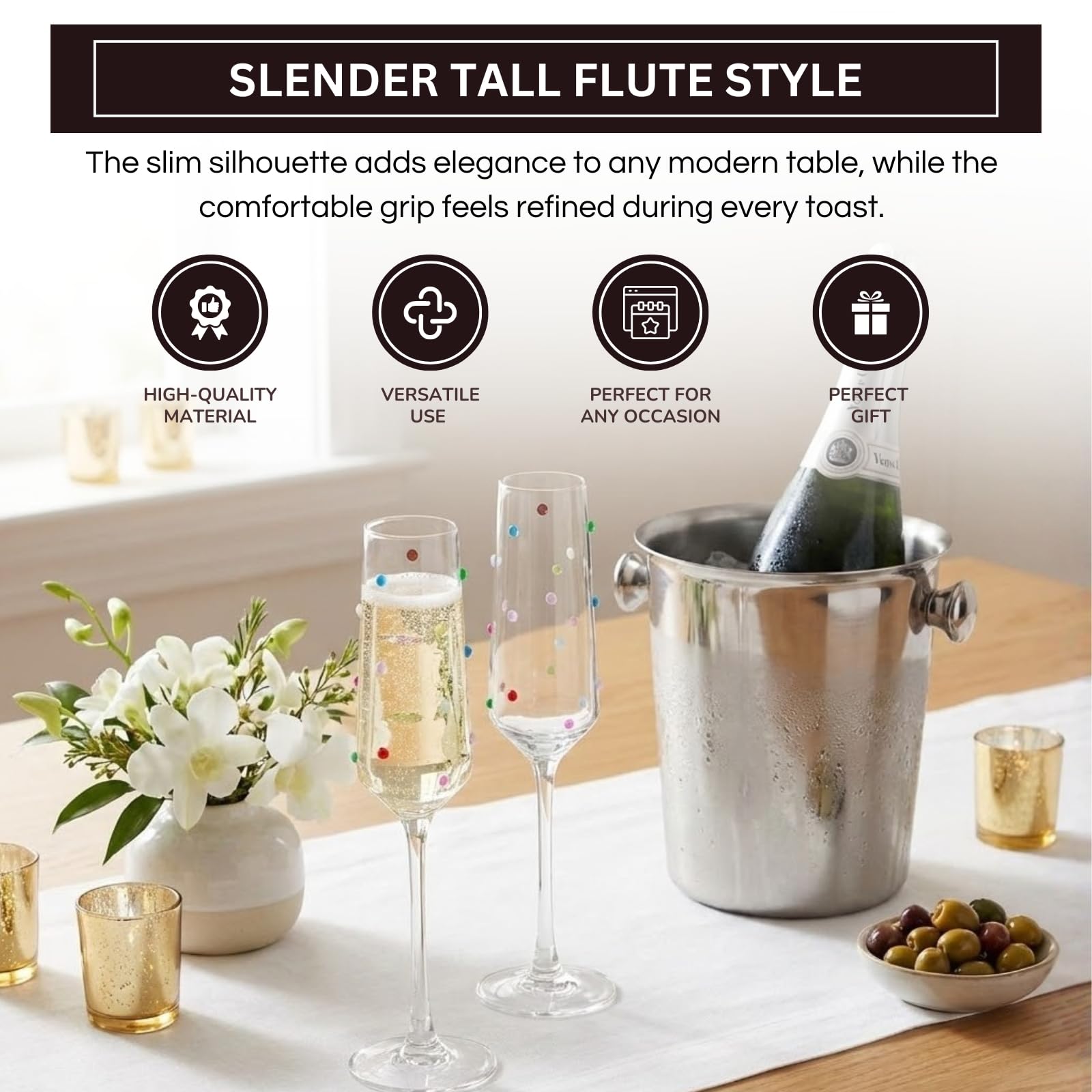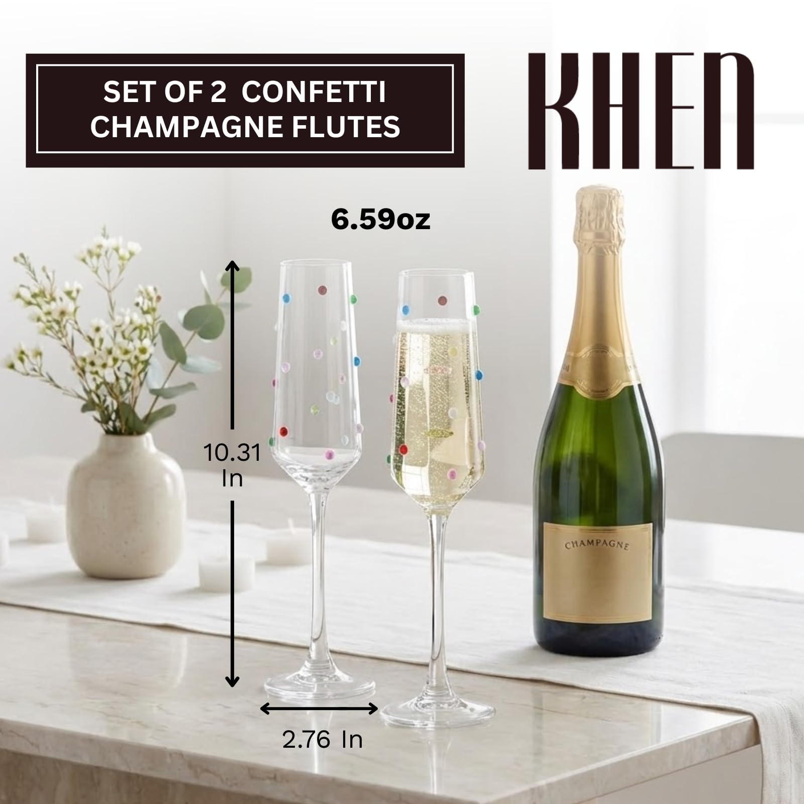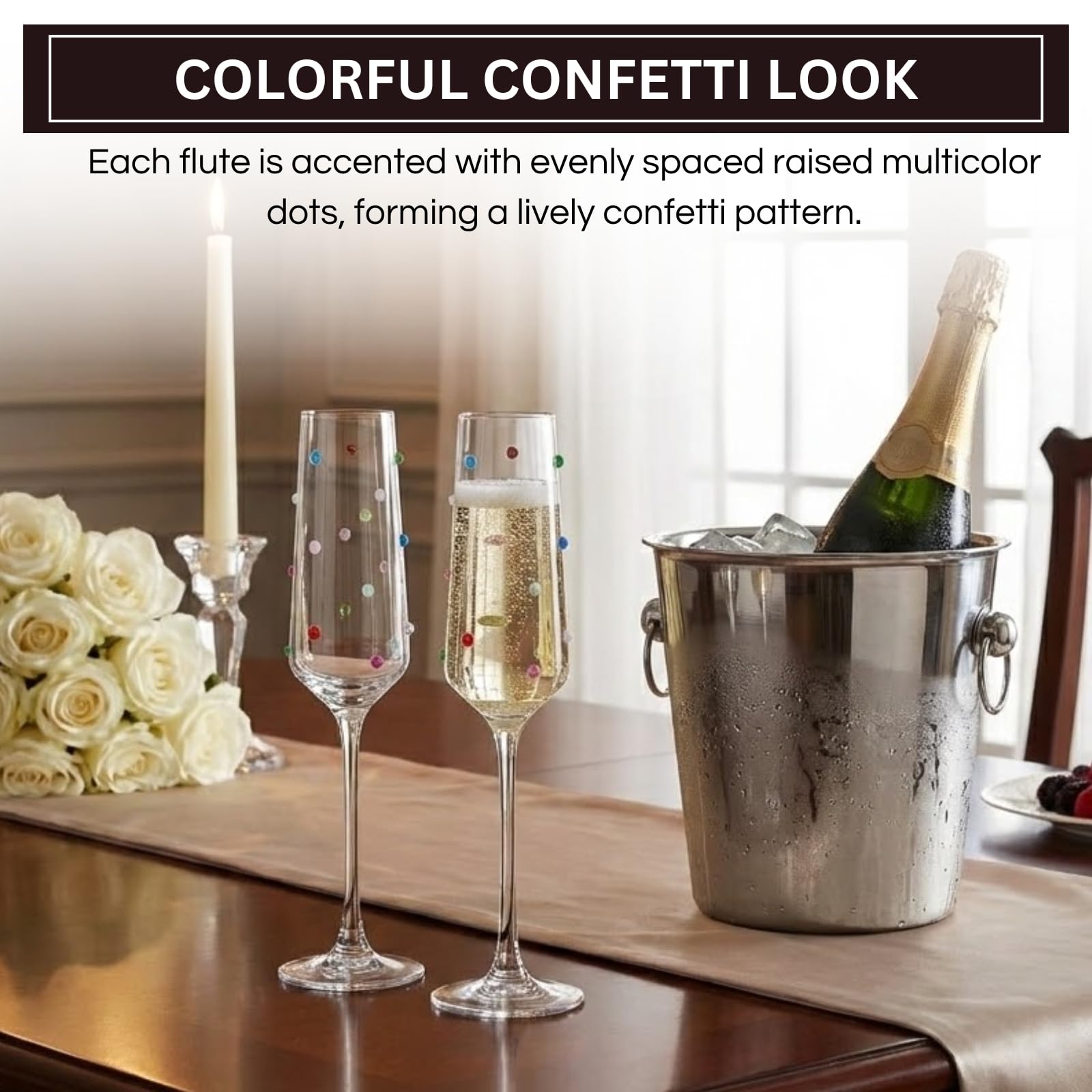 Confetti Champagne Flutes Set of 2, 6.59oz Colorful Clear Glass Stemmed Goblets for Sparkling Wine and Beverages, Elegant Handmade Drinkware Weddings Parties Celebrations Housewarming Gifts
