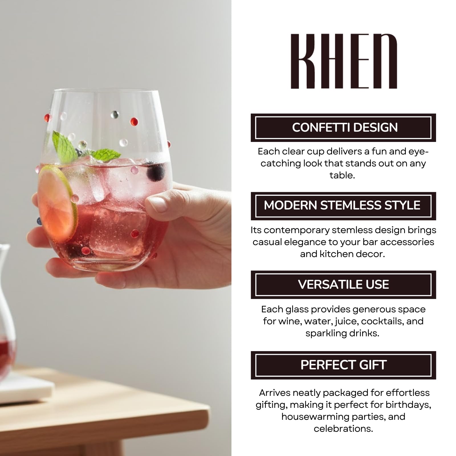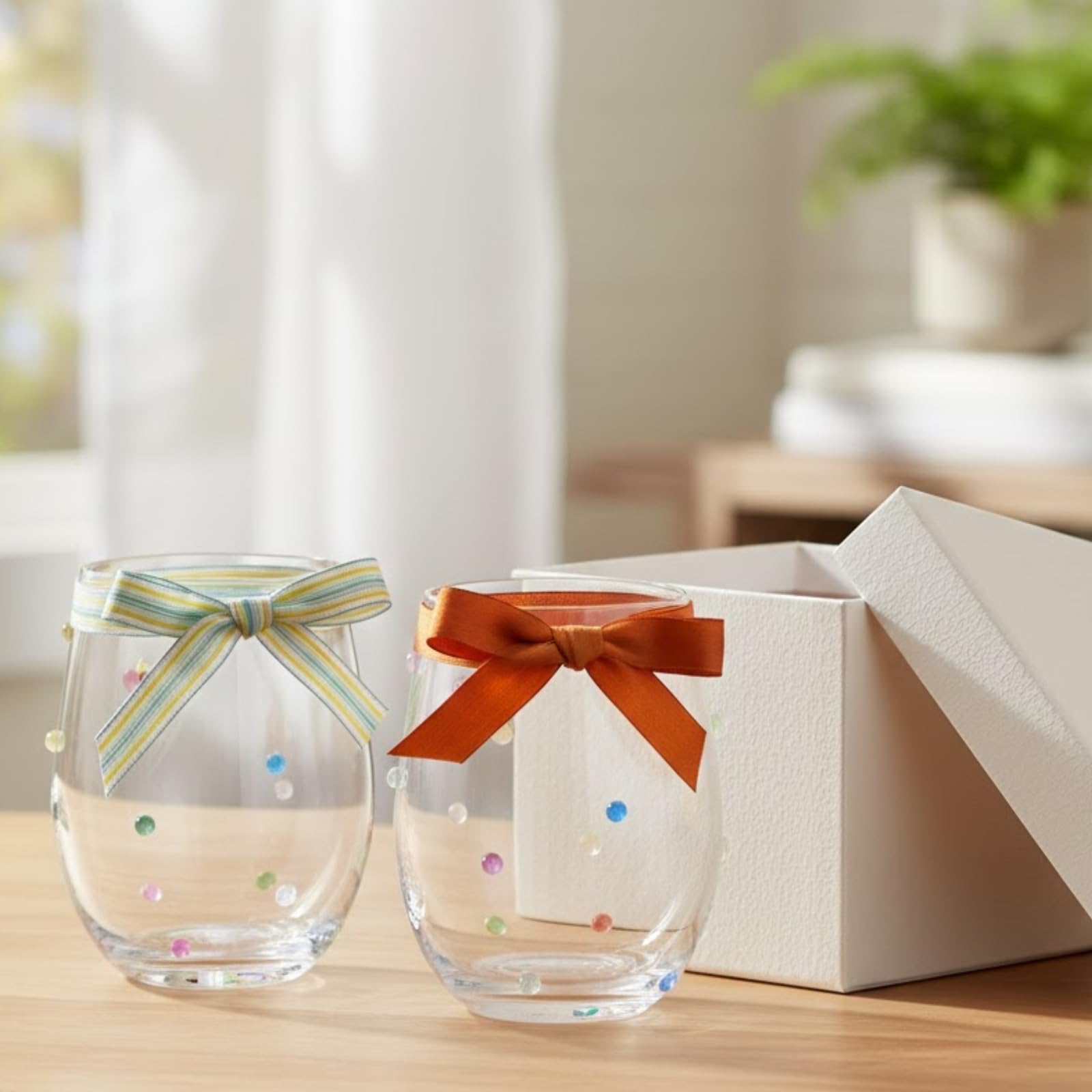 The Confetti Stemless Wine Glasses Set of 2 brings a colorful and modern touch to any beverage with its playful confetti pattern and sleek rounded silhouette. Each glass is individually handmade, giving this stemless glassware a unique design that stands out in kitchen decor, dining setups, and home bar displays. With an 18.6 oz capacity and durable construction, each tumbler is perfect for everyday drinking—whether enjoying water, juice, cocktails, wine, or sparkling drinks. Ideal for entertaining and party settings, this versatile drinking set adds charm to any occasion. Packed for effortless gifting, it makes a thoughtful handmade gift for birthdays, housewarming celebrations, or anyone who loves stylish bar accessories.
