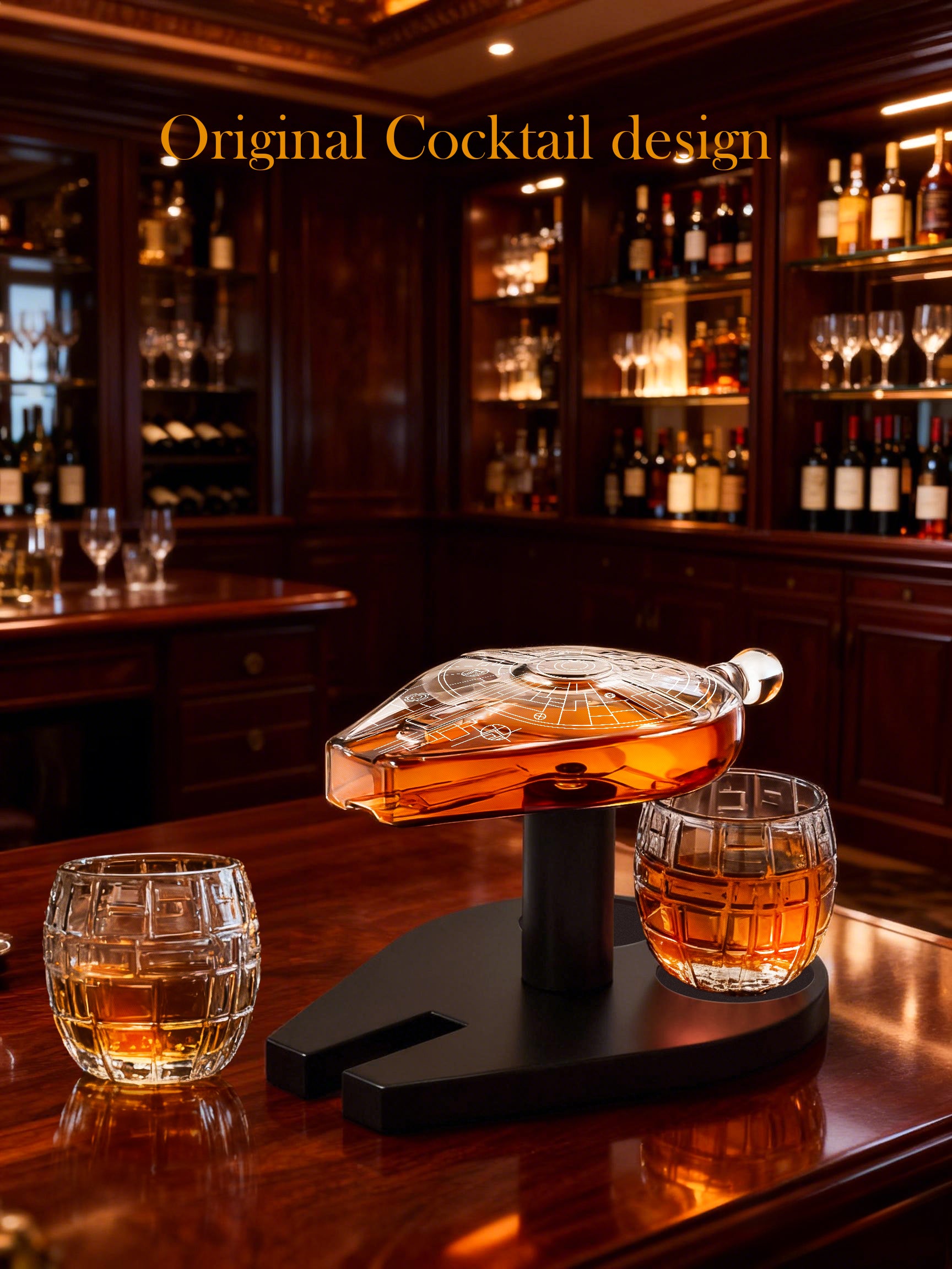 The Galactic Cruiser Decanter Set is a striking spaceship decanter set crafted from premium borosilicate glass for durability and clarity. This crystal alcohol container showcases the rich color of bourbon, scotch, or whiskey while serving as a futuristic spacecraft display and collectible home decor piece. Designed as a bourbon carafe and liquor holder, it includes two glasses for a complete geek drinking kit. A novelty wine vessel and unique gift for men, this whiskey glassware and bar accessory adds style, creativity, and conversation to any home bar, office, or game room.