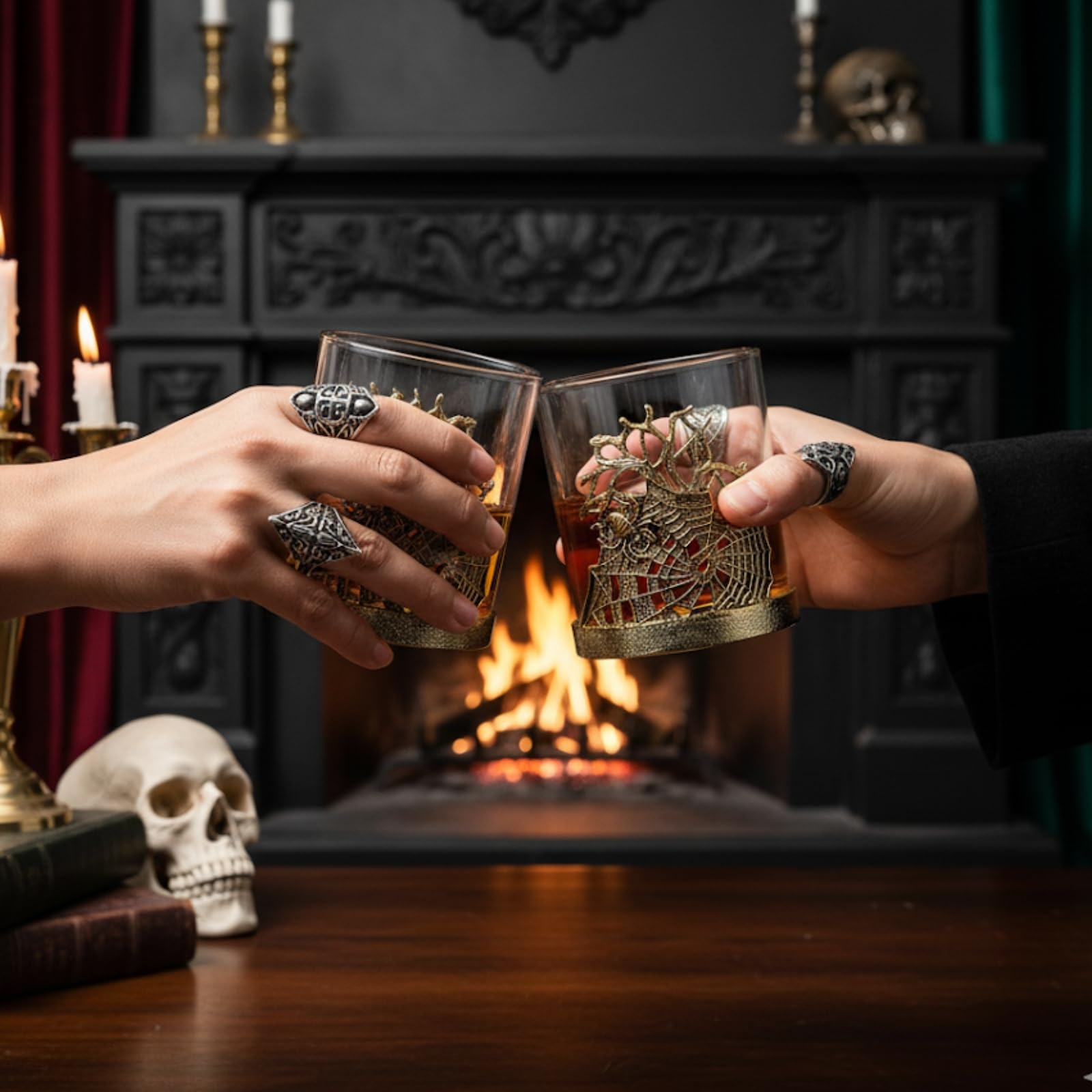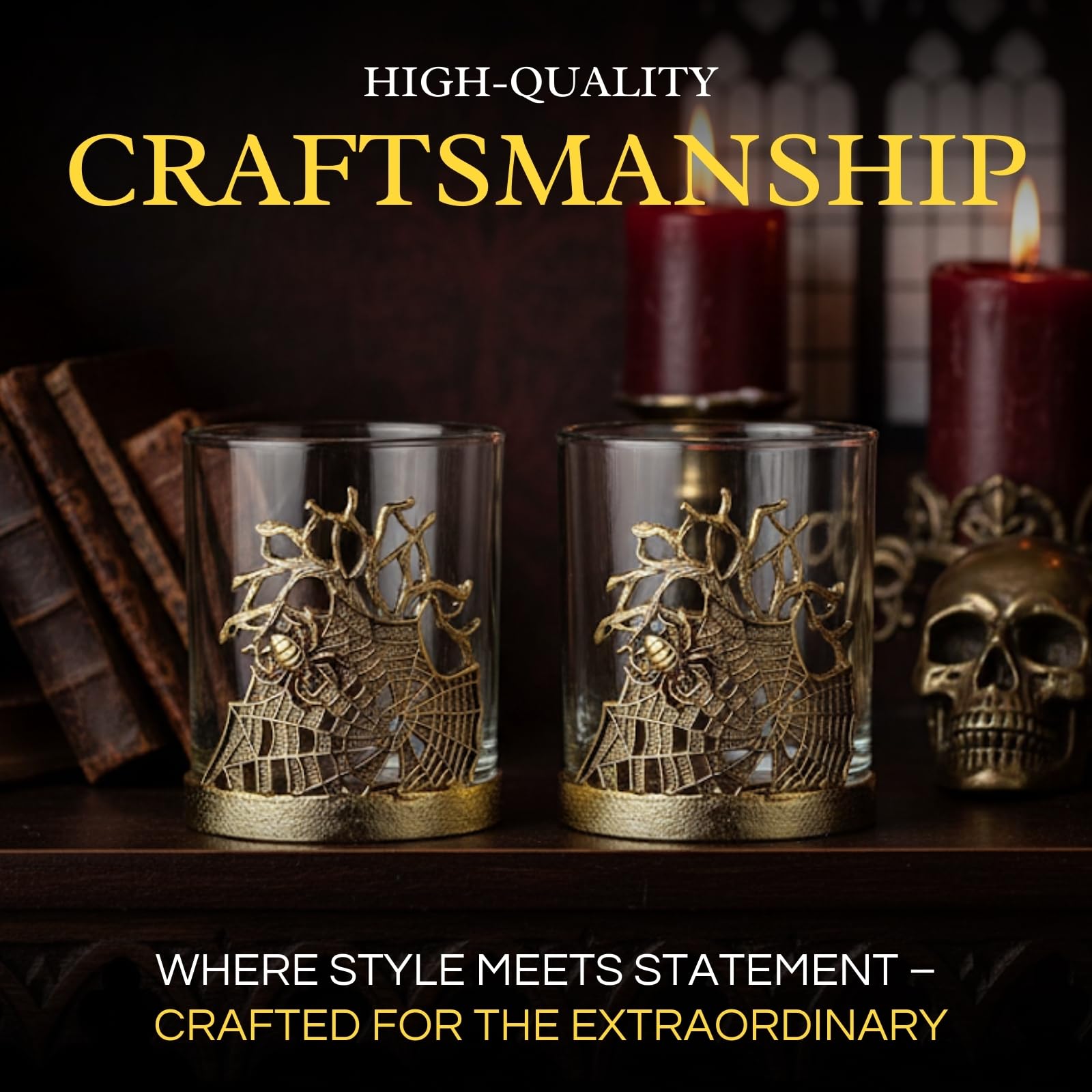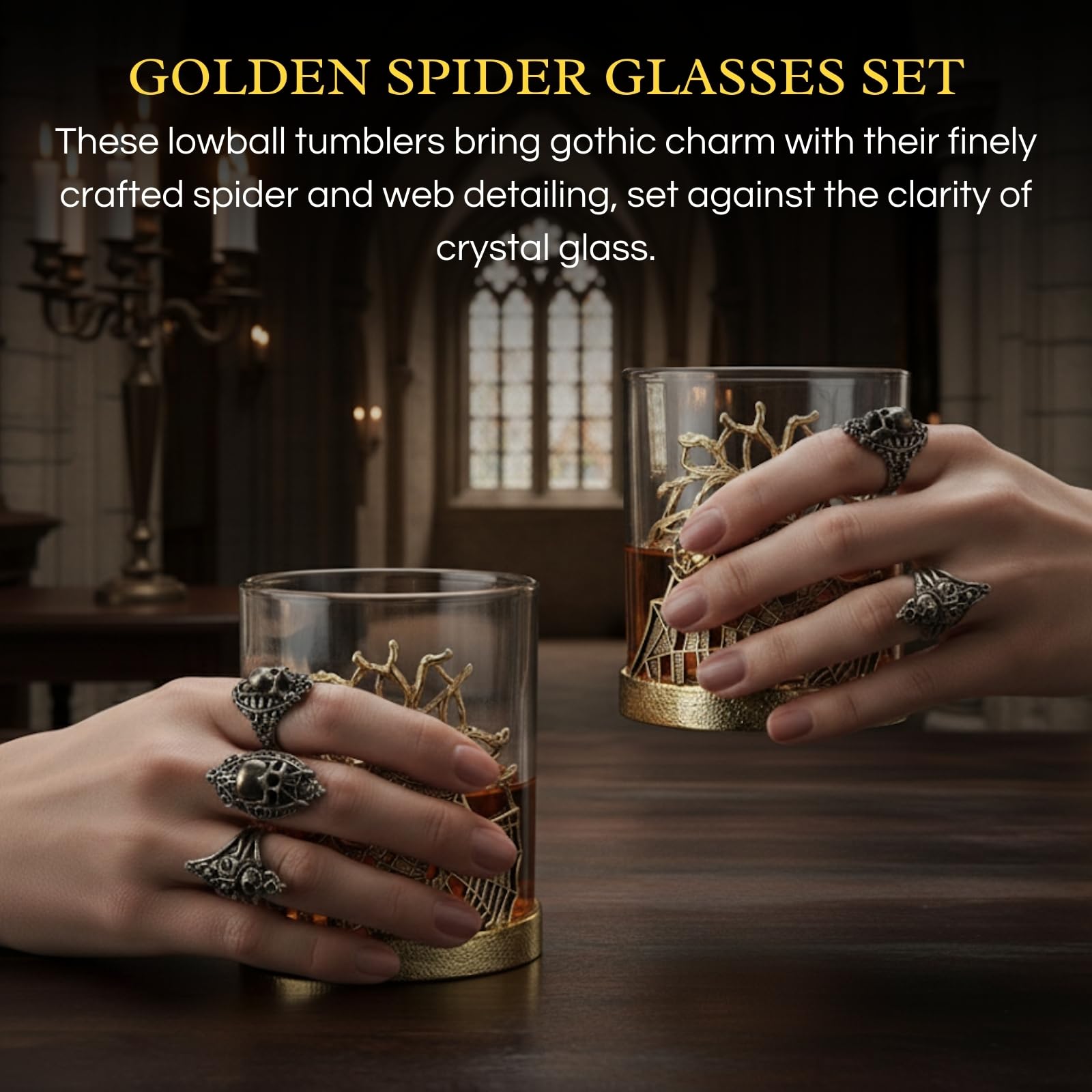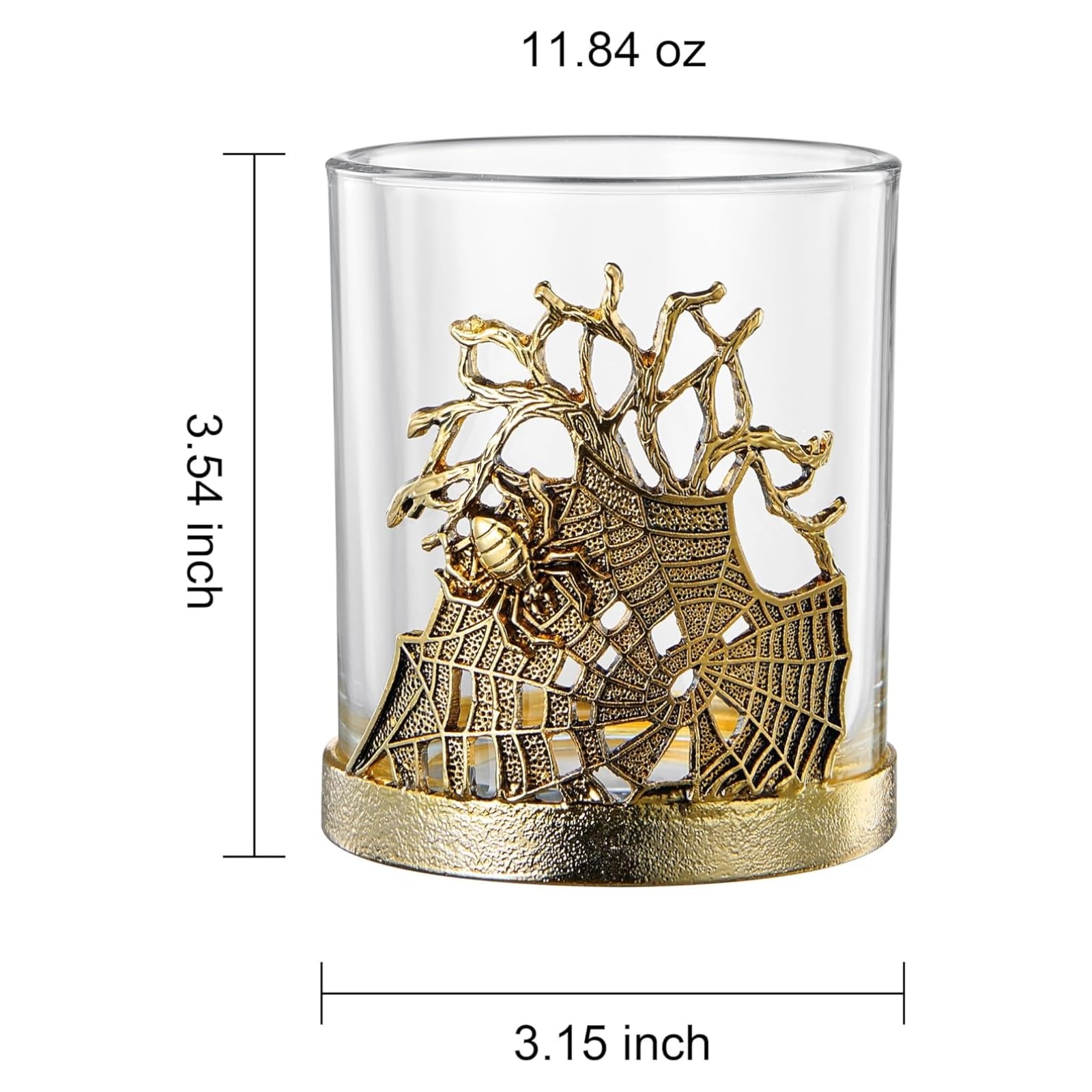 Elevate your barware with the Golden Spider Whiskey Glasses Set of 2, a gothic lowball pair featuring intricate spider and web detailing wrapped around a borosilicate glass. Crafted with an alloy steel base, these decorative tumblers are both durable and elegant, making them perfect for bourbon, scotch, rum, or cocktails. Their spooky yet stylish design transforms drinking into a unique experience while doubling as display-worthy glassware. Ideal for dining, parties, or Halloween gatherings, they add vintage flair to any setting. A memorable gift for collectors, whiskey lovers, or anyone who values distinctive barware with artistry and presence.
