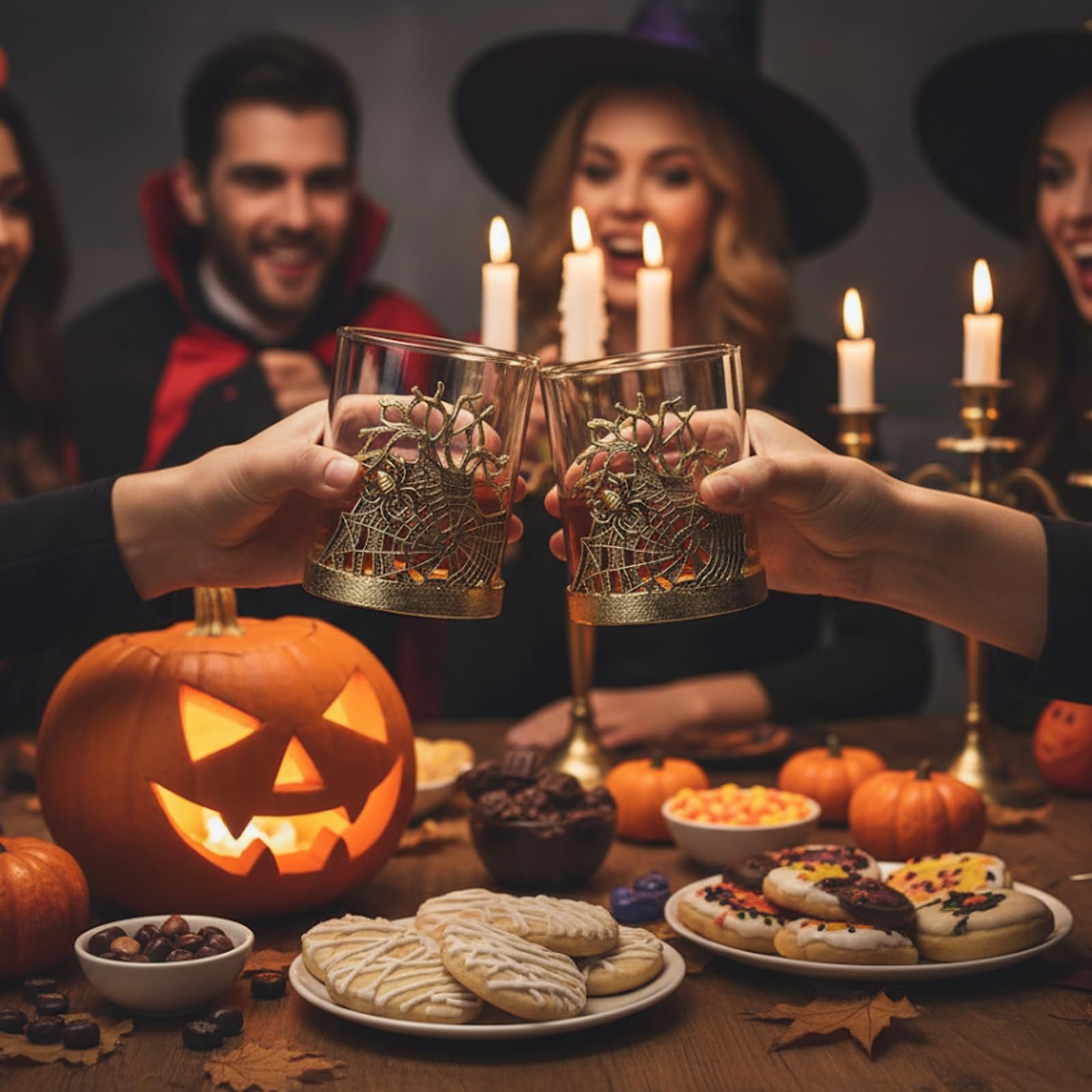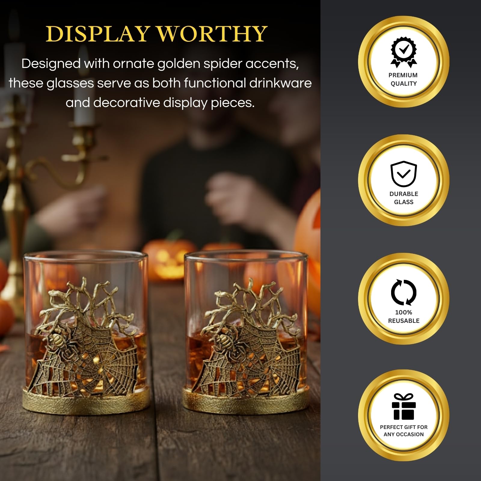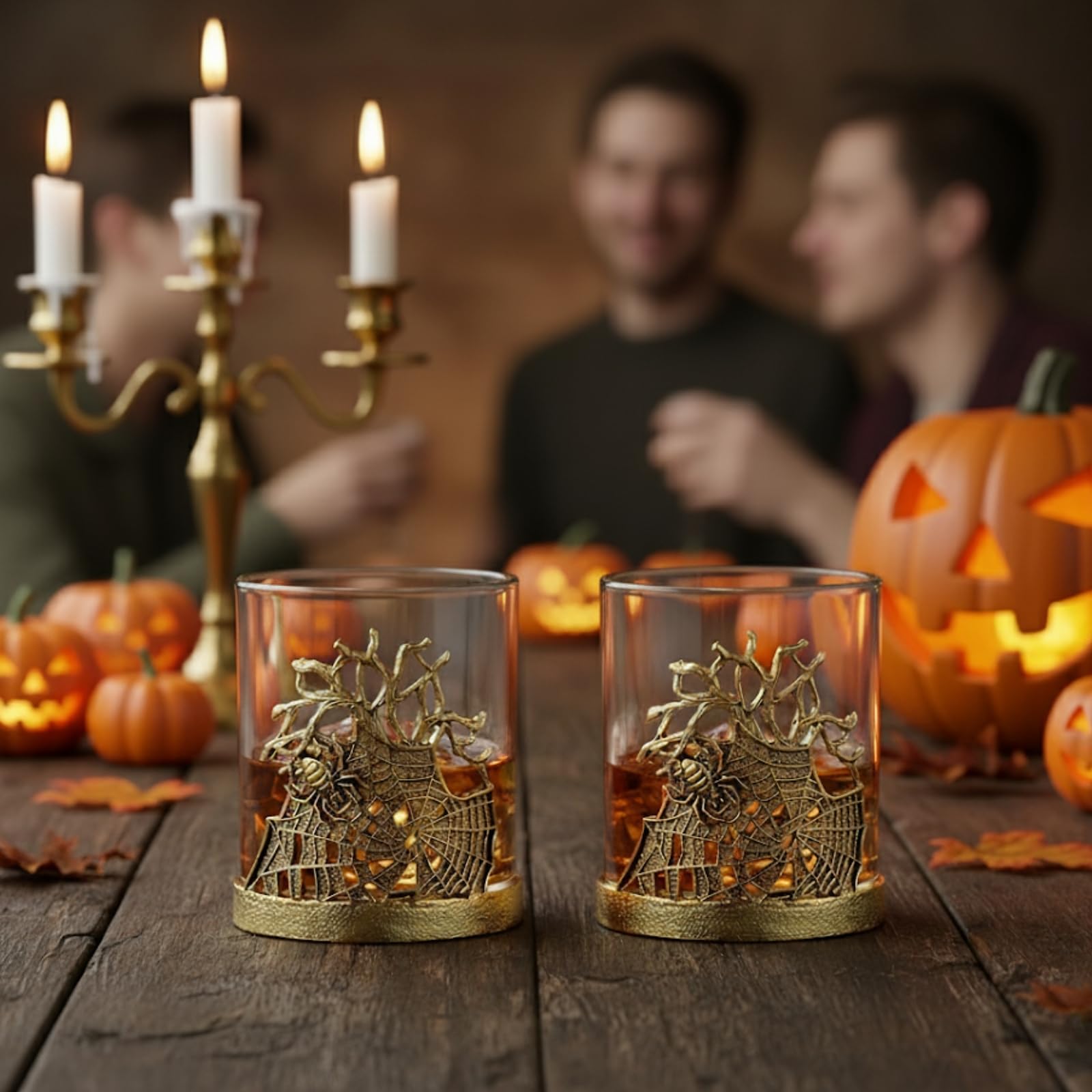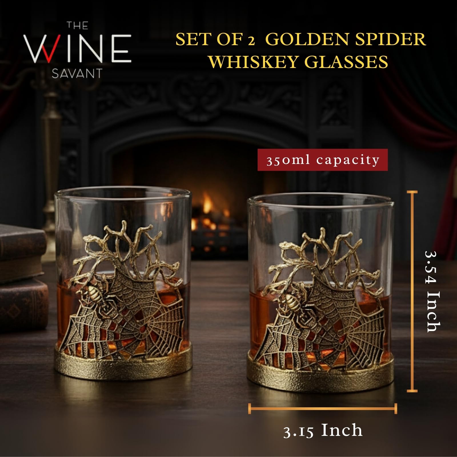 Elevate your barware with the Golden Spider Whiskey Glasses Set of 2, a gothic lowball pair featuring intricate spider and web detailing wrapped around a borosilicate glass. Crafted with an alloy steel base, these decorative tumblers are both durable and elegant, making them perfect for bourbon, scotch, rum, or cocktails. Their spooky yet stylish design transforms drinking into a unique experience while doubling as display-worthy glassware. Ideal for dining, parties, or Halloween gatherings, they add vintage flair to any setting. A memorable gift for collectors, whiskey lovers, or anyone who values distinctive barware with artistry and presence.