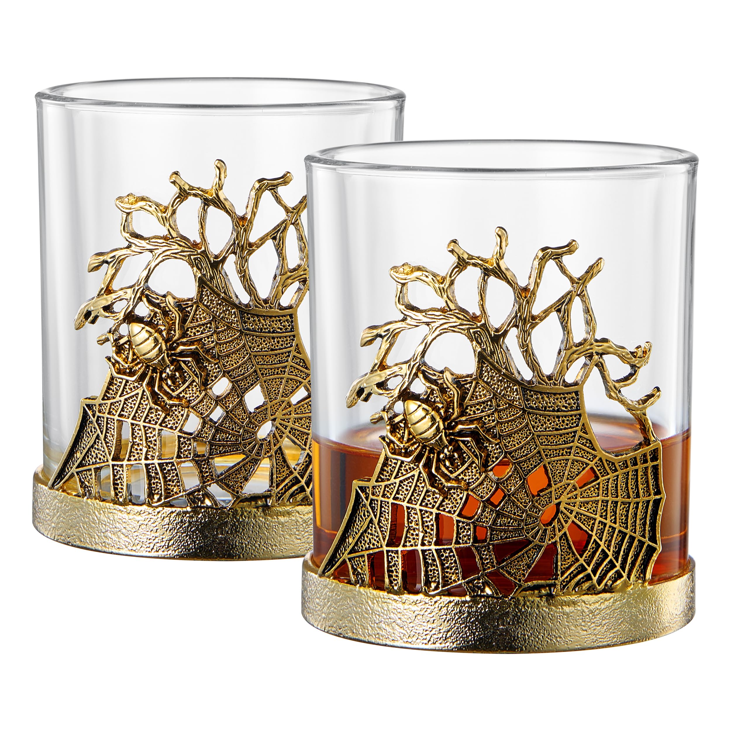 Golden Spider Whiskey Glasses Set of 2 Gothic Lowball Tumblers with Metal Web Design and Borosilicate Glass Unique Barware for Bourbon Scotch Halloween Decor Spooky Gift for Men Home Bar Collectors