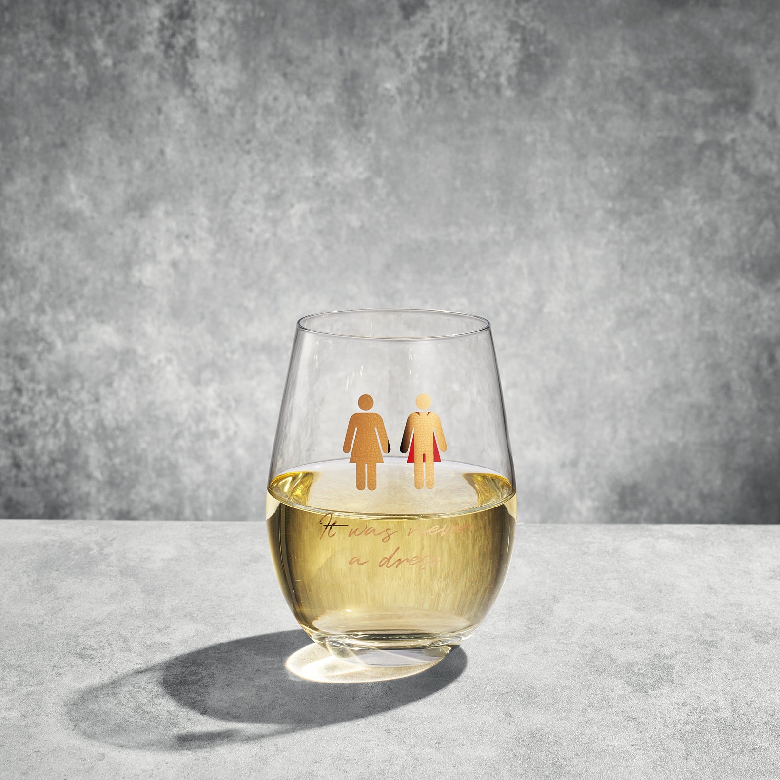 - The "It was never a dress" Wine Glass is a remarkable testament to the celebration of female empowerment and the unyielding spirit of women. Designed with a powerful message that challenges traditional gender norms, this wine glass serves as a beacon of strength and resilience. The elegant design of the glass features the iconic woman symbol's dress transformed into a majestic cape, symbolizing the extraordinary power and capabilities inherent in women.