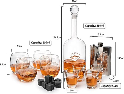 - HIGH QUALITY CRAFTSMANSHIP: All glass is made from premium borosilicate which is hypoallergenic, BPA-free, and 100% lead-free. Pour with poise and precision. The Decanter can hold up to 29 ounces of your favorite liquor, which you can then pour into our Marine Glasses, holding up to 10 ounces, or the bullet shot glasses, holding up to 1.6 ounces.