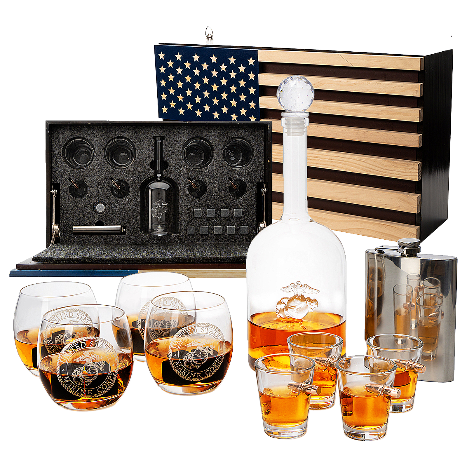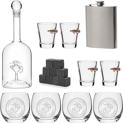 - STRIKING & UNIQUE GIFT: A perfect gift for veterans. This gift set comes with everything a Marine would want to unwind with, including a decanter, 4 marine glasses, 4 bullet shot glasses, and a marine flask all encased in a beautiful American Flag Mahogany wood case. Appropriate for birthdays, anniversaries, Christmas, Valentine’s Day, Father’s Day, Mother's Day, Veteran’s Day, and Independence Day celebrations.