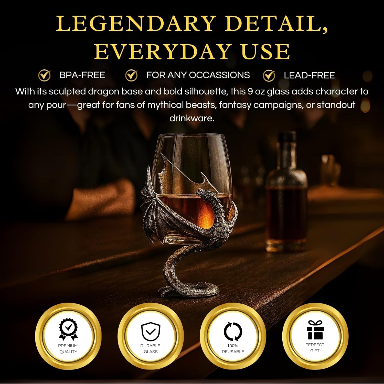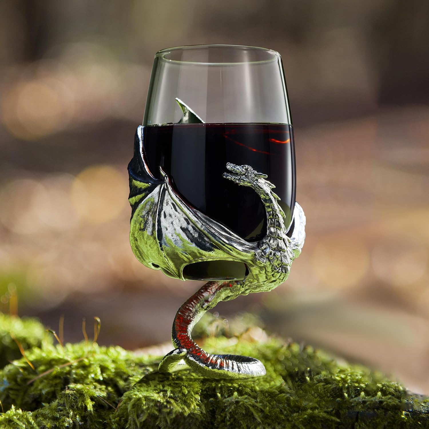 A striking fantasy-inspired design for fans of mythical creatures and epic storytelling: This drinking glass showcases a dramatic sculpted dragon wrapped around the base, with outstretched wings and a curling tail that serves as a sturdy support. Meticulously crafted, this design brings an element of fantasy to your barware, making it a standout piece for those who appreciate imaginative themes and artistic detail.