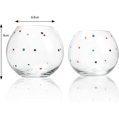 - Accentuate your home decor with these polka dot wine glasses. Made of durable, borosilicate glass, this two-pack will be your go-to for any occasion. Enjoy a chilled glass of your favorite vino with elegance! These polka dot wine glasses are the ideal way to relax and enjoy a nice drink on a hot summer day. These glasses are perfect for use during dinners, parties or other gatherings with friends. Treat your wine to a drink in these exquisite, lead-free glass polka dot wine glasses