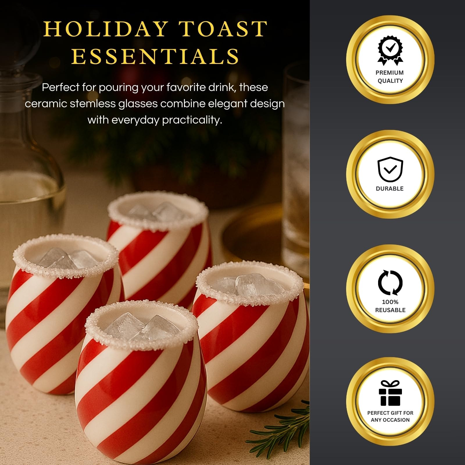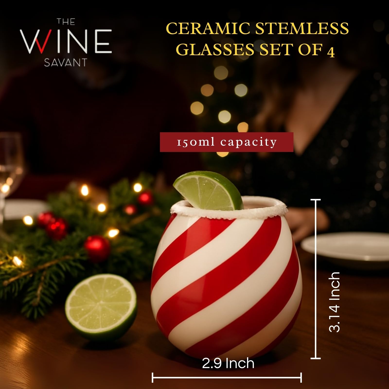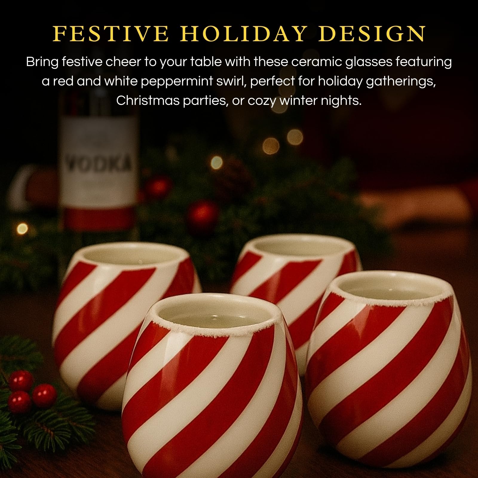 Celebrate the season with our Christmas Ceramic Stemless Wine Glasses, featuring a festive red and white peppermint swirl design that brightens any winter table decor. Made from durable ceramic, these striped holiday drinkware pieces are perfect for wine, hot cocoa, or cocktails. This set of four doubles as unique glassware and seasonal beverage holders, perfect for festive mugs or party cups. Whether for entertaining or gifting, these stylish tumblers enhance your Christmas dinnerware, kitchen barware, or holiday celebrations with charm and function.