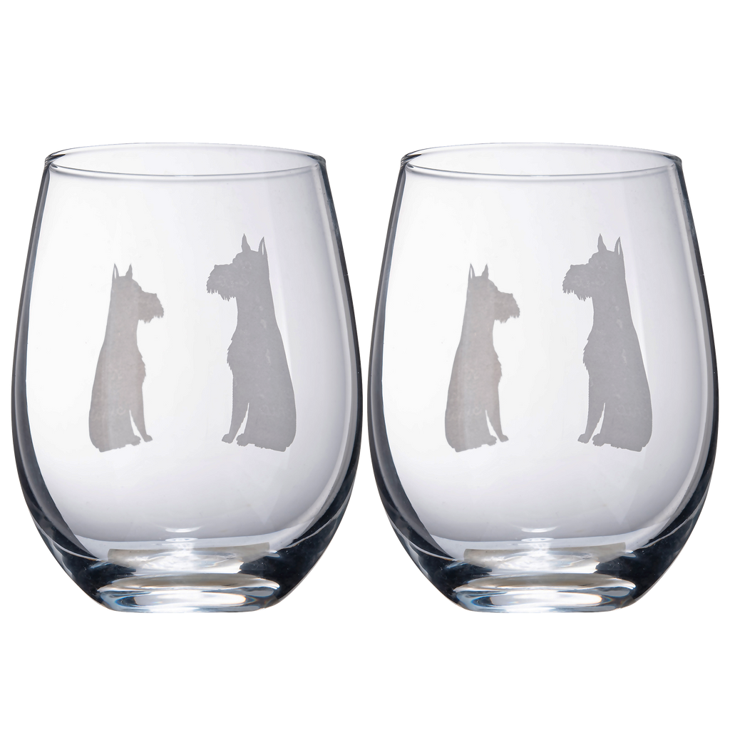- This beautiful wine glass set is perfect for any Schnauzer lover! This set of two stemless wine glasses features the iconic profile of a Schnauzer and delightfully etched designs on the glass. Show your love for the dog in your life with our carefully crafted Schnauzer Wine Glasses. A perfect gift for dog lovers, this set will help you enjoy your favorite wine in style. Guaranteed to make any wine lover or dog lover smile, these etched stemless wine glasses are the perfect present!