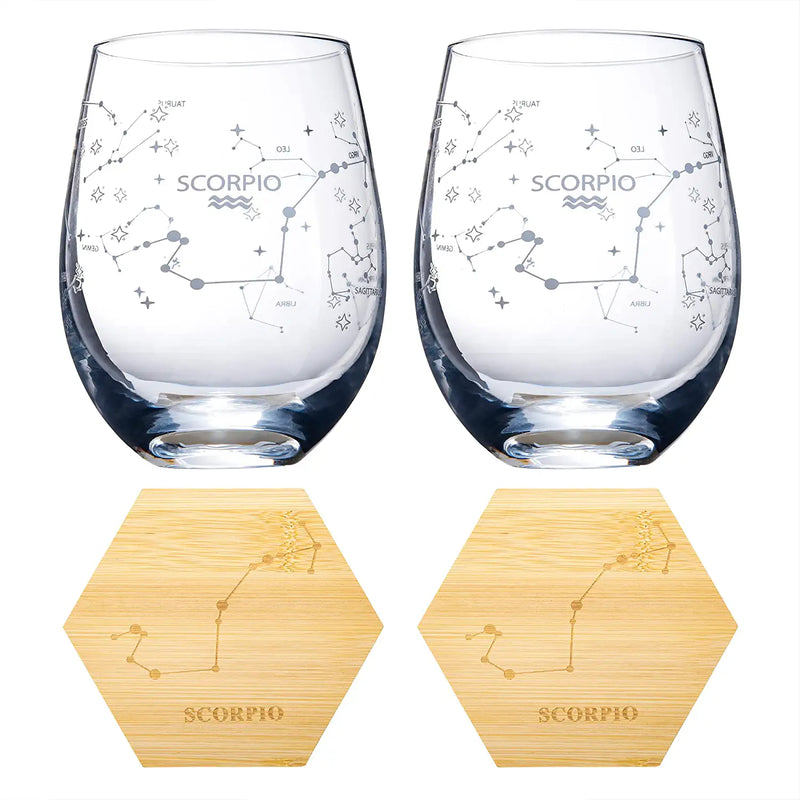 - These Zodiac Sign Glasses come with two matching sign coasters and are the ultimate party favors for your next constellation party, star-gazing gathering, or just to keep around the house! Celebrate your birth sign with this unique gift set that includes two etched constellation wine glasses and matching coasters made from mahogany wood. Each glass is etched with a different sign. These make amazing gifts for those who love astronomy, astrology, star gazing, or just decor accessories!