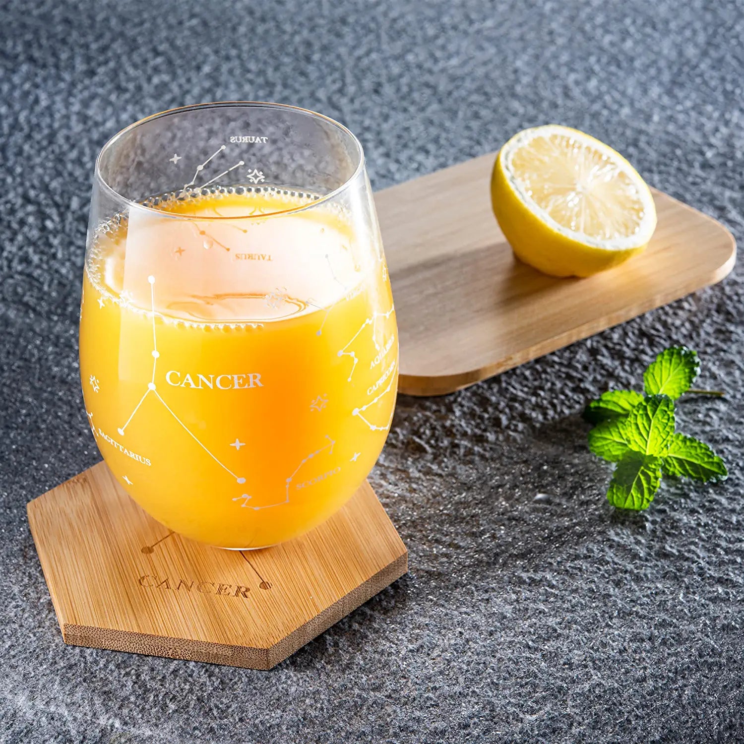 - These Zodiac Sign Glasses come with two matching sign coasters and are the ultimate party favors for your next constellation party, star-gazing gathering, or just to keep around the house! Celebrate your birth sign with this unique gift set that includes two etched constellation wine glasses and matching coasters made from mahogany wood. Each glass is etched with a different sign. These make amazing gifts for those who love astronomy, astrology, star gazing, or just decor accessories!