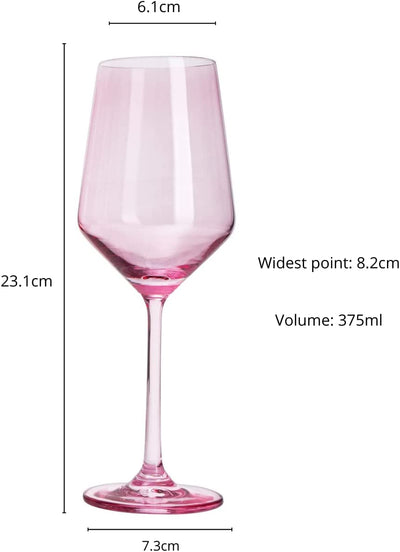 - Get ready to elevate the elegance of your home and host the perfect parties. This set gives you 6 colored glasses, so that you can enjoy your favorite wine with the right glass. Hand blown, lead free, crystal bordeaux wine glasses are made with the highest quality Italian style glass. These beautiful hand-crafted drinking glasses are designed with careful attention to detail for a flawless look. Each colored stemless wine glass measures 5" in height, and 3.5" in diameter.