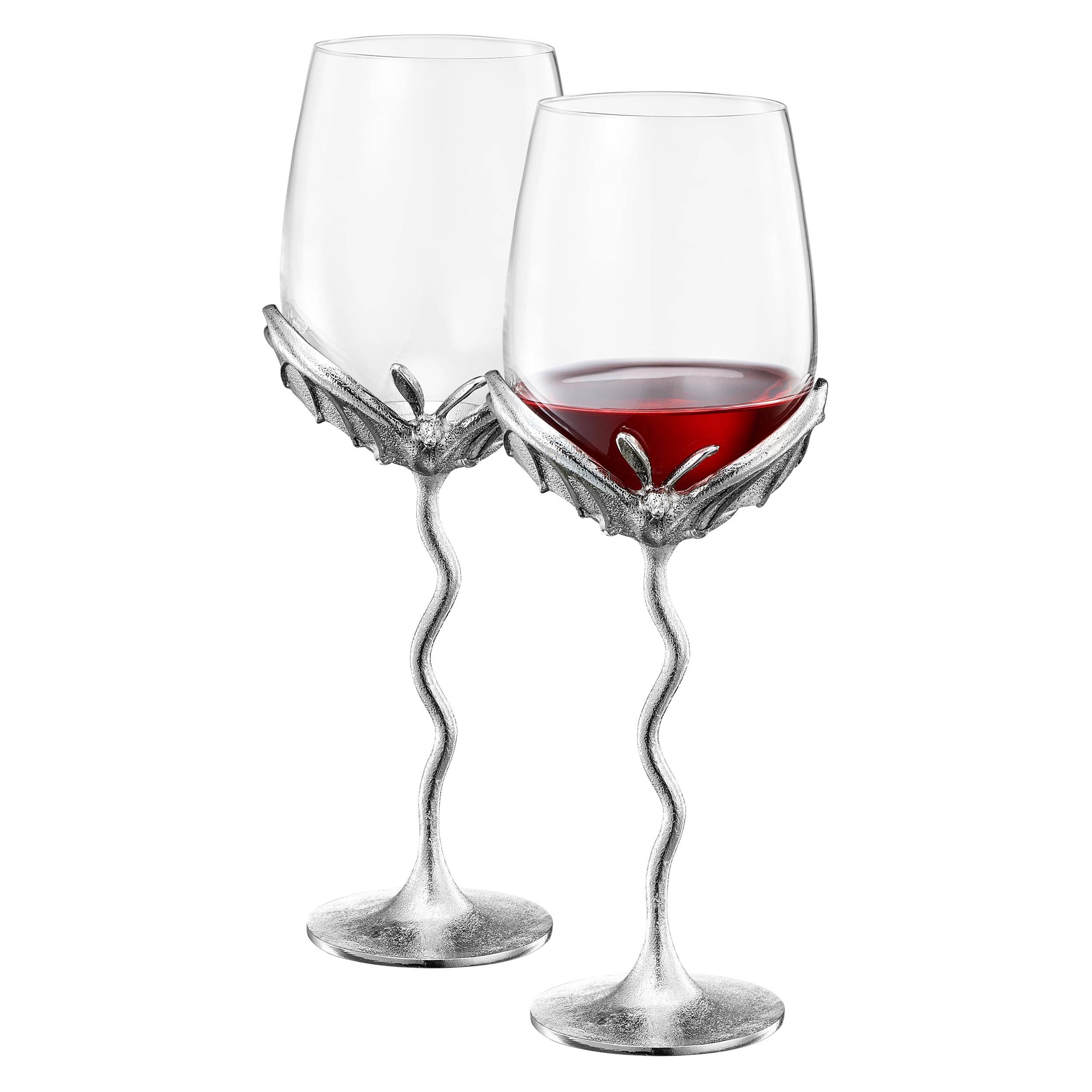 Silver Bat Wine Glasses Set of 2 Gothic Goblet Pair with Alloy Steel Stems and Borosilicate Glass Unique Barware Decorative Halloween or Vampire Glassware for Wine Party Dining Table or Holiday Gift