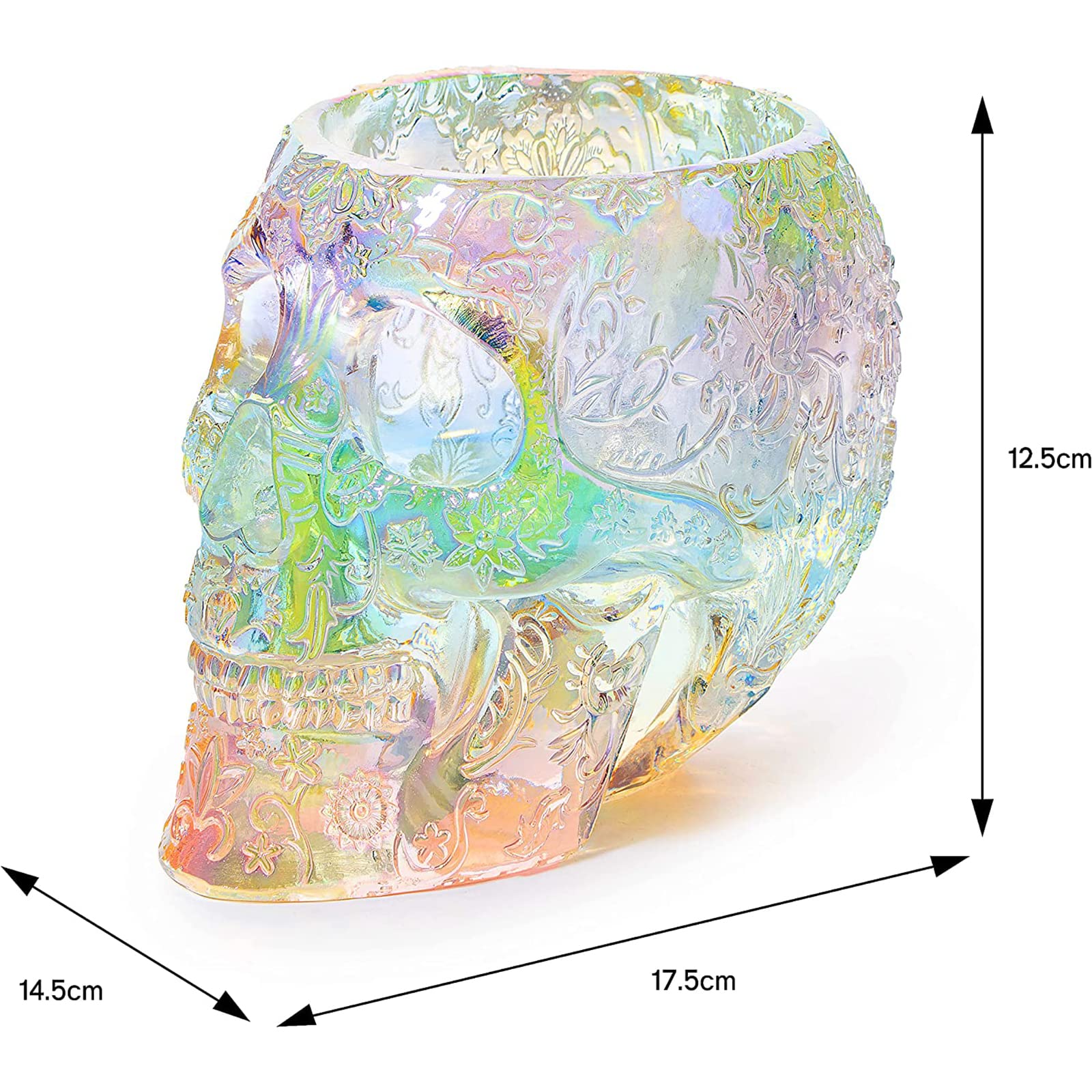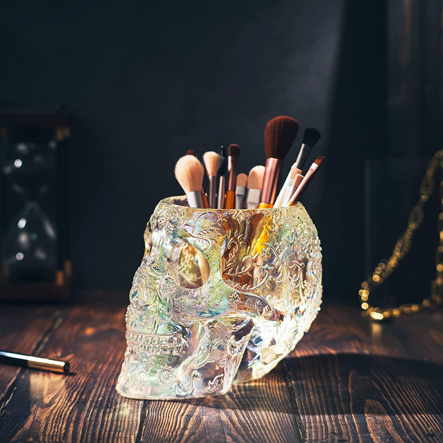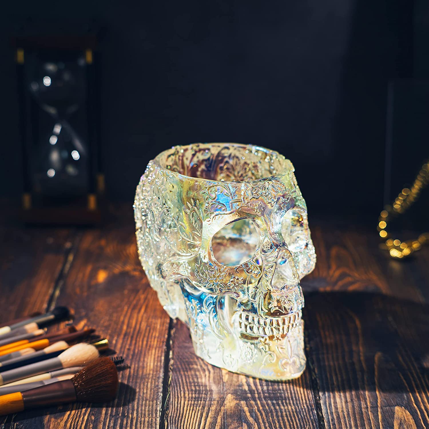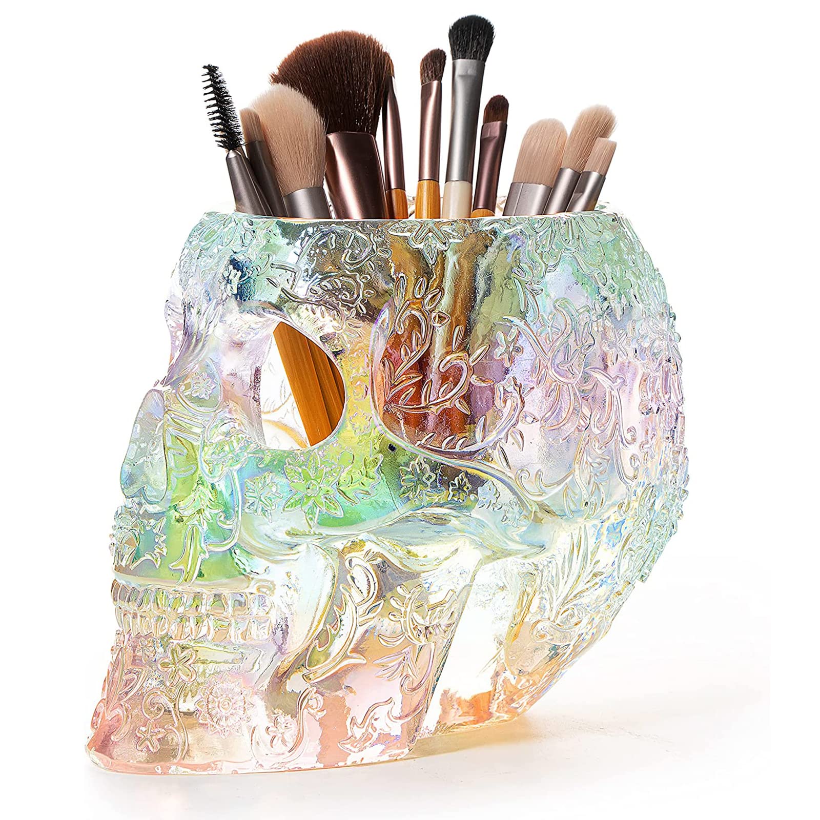UNIQUE DESIGN: Add a touch of edgy elegance to your desk or vanity with our Skull Makeup Brush Holder. Made with an Iridescent solid resin, this strong and sturdy holder is the perfect size to hold your makeup brushes, pens, keys, phone, and more. Size 7" x 5.7" x 5" - 17.5cm x 14.5cm x 12.5cm