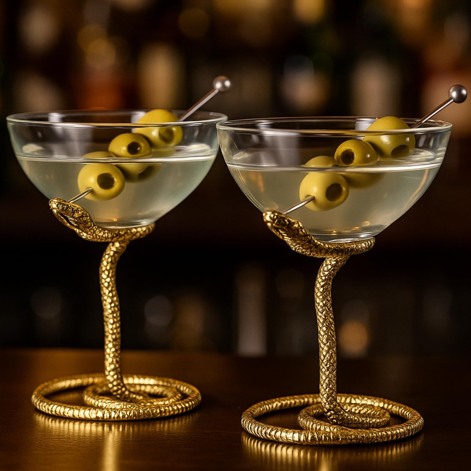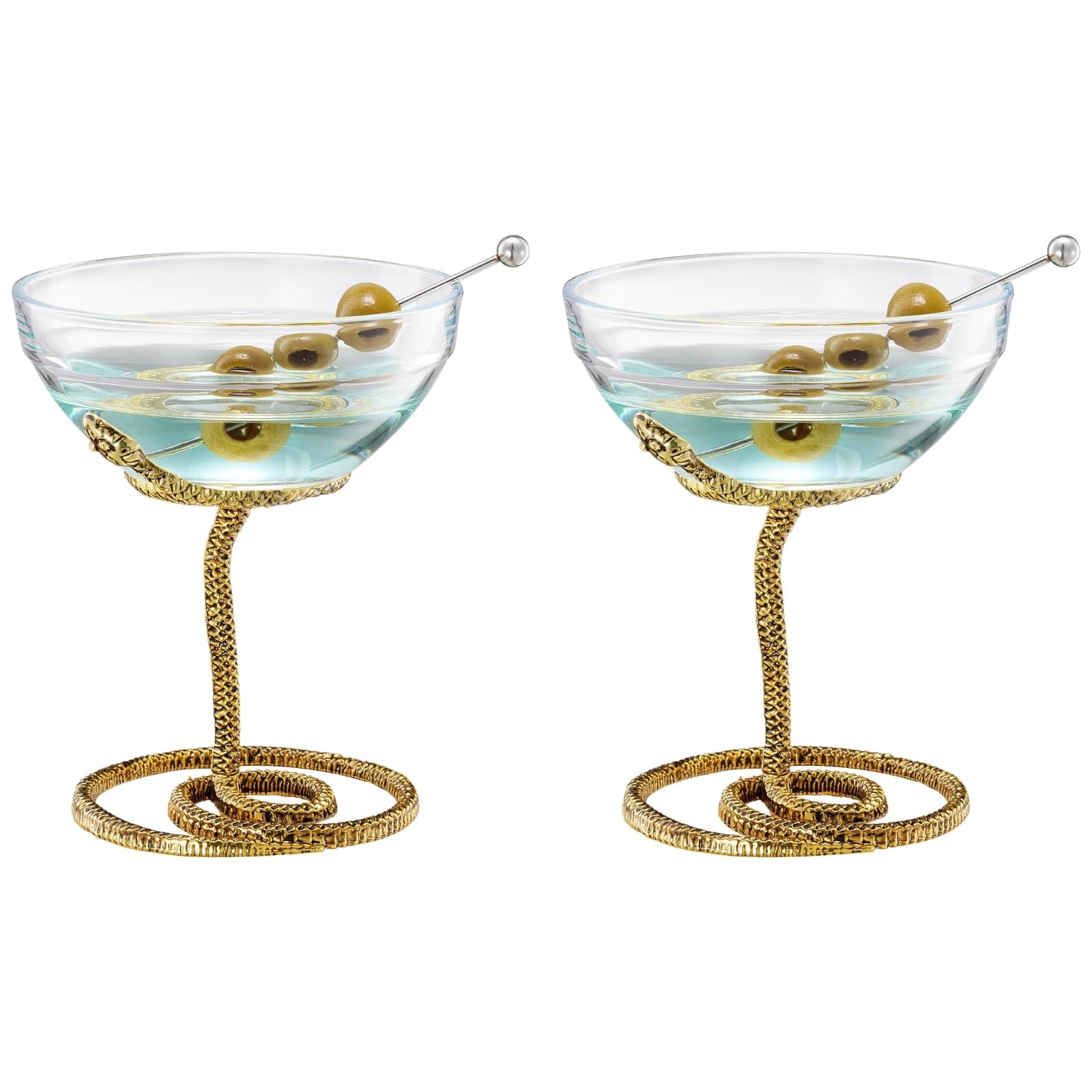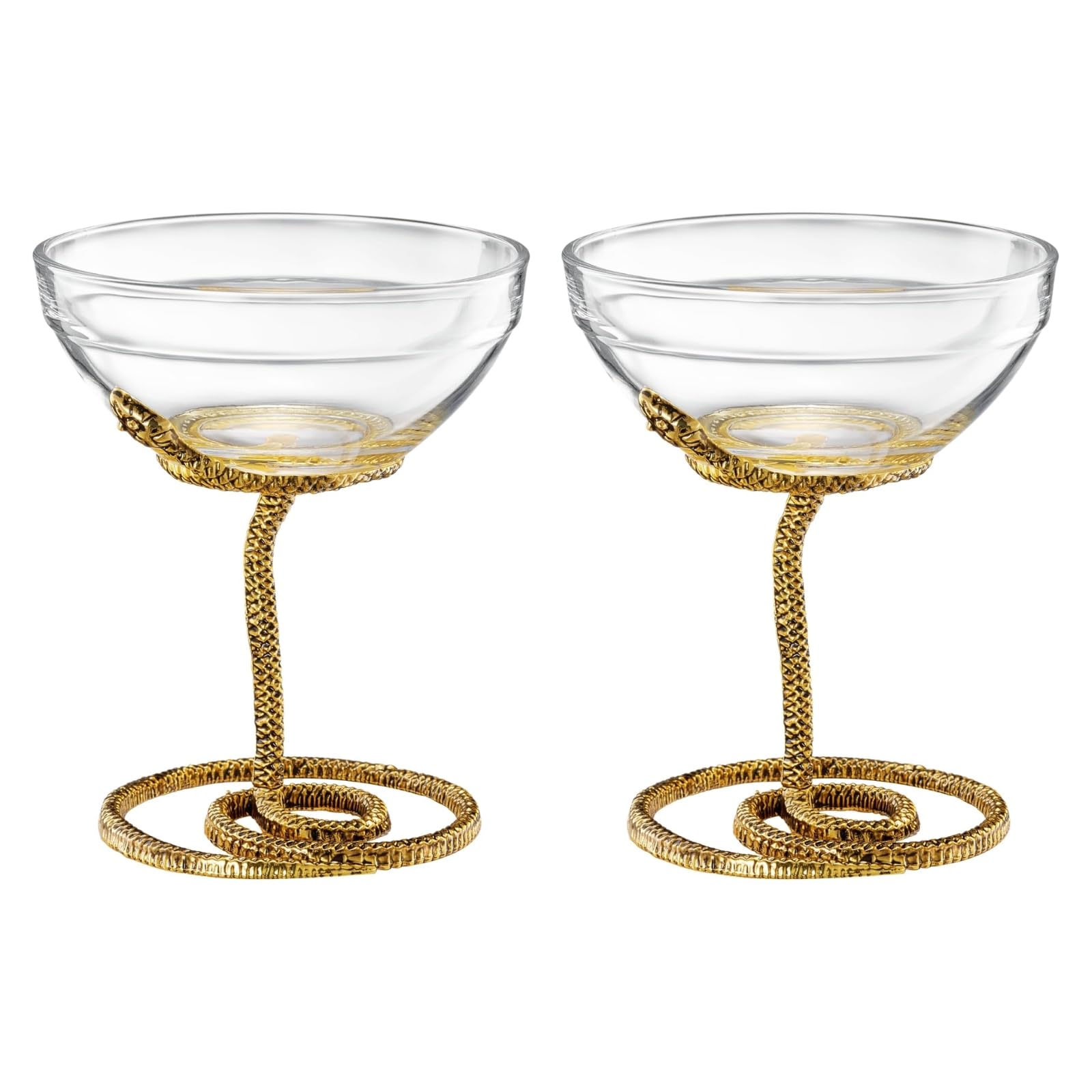 The Snake Serpent Cocktail Glasses set features two martini coupes with a luxurious gold serpent coiled around the stem, adding reptile-inspired elegance and décor flair. Crafted from durable clear glass with gold-finished metal, each mixed drink cup holds 6.76 oz and measures 5.12 inches tall by 4.13 inches wide. Perfect for martinis, champagne, cocktails, or mocktails, these collectible vessels serve as both functional barware and statement glassware. Ideal for themed gatherings, weddings, birthdays, or spooky party accents, they make a distinctive gift for snake lovers, hosts, and those who appreciate elegant serving pieces.