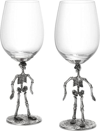 - It's a ghoulish good time always with our Stemmed Skeleton wine glasses! A must have for Halloween or any time of the year you want to celebrate the macabre. Be a little more frightening at your next dinner party! This spooky wine glass set is a great gift for any wine lover! Perfect for Halloween and beyond, the design of this two-piece set recalls a vintage ossuary. Scare the heck out of your guests while they enjoy their favorite vino.