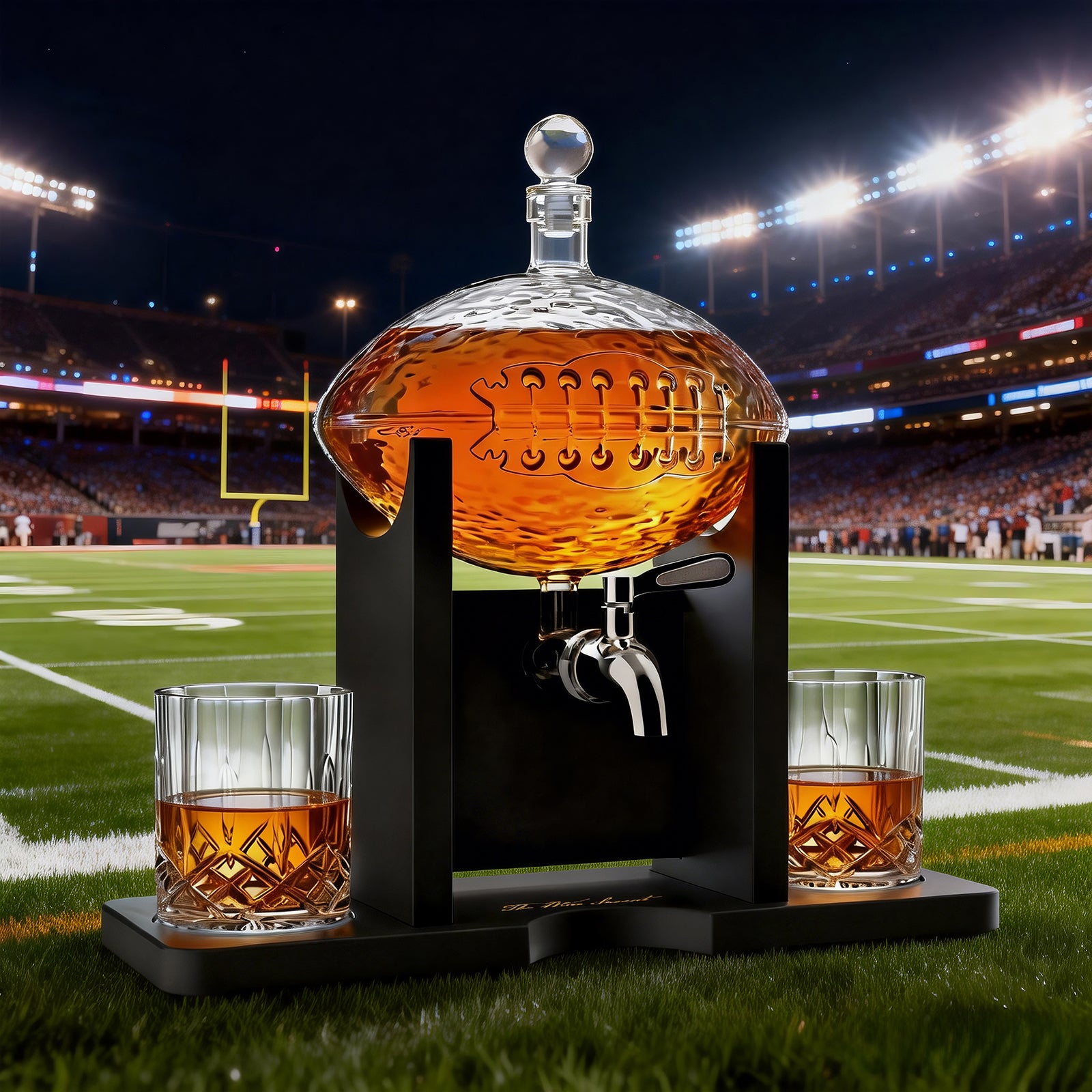 - The Football Decanter Set is a stunning homage to one of America's most beloved sports, combining the elegance of fine spirit enjoyment with the rugged charm of football. At its heart lies a 1400 mL decanter, masterfully crafted to resemble a football, capturing the intricate details and iconic shape that fans know and love. Whether displayed on a home bar, office, or as a centerpiece during game day gatherings, it's bound to catch the eye and admiration of fellow enthusiasts.